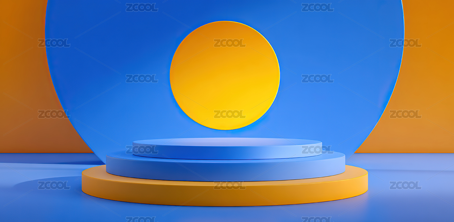 蓝色背景上的金色圆环与圆形台座