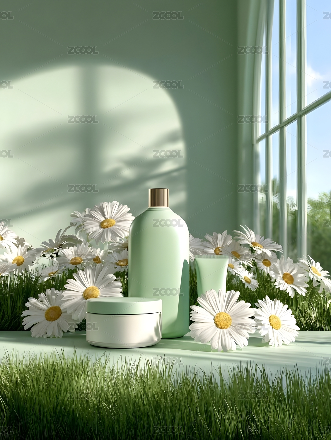 白色瓶身搭配雏菊的简约美容产品静物摄影