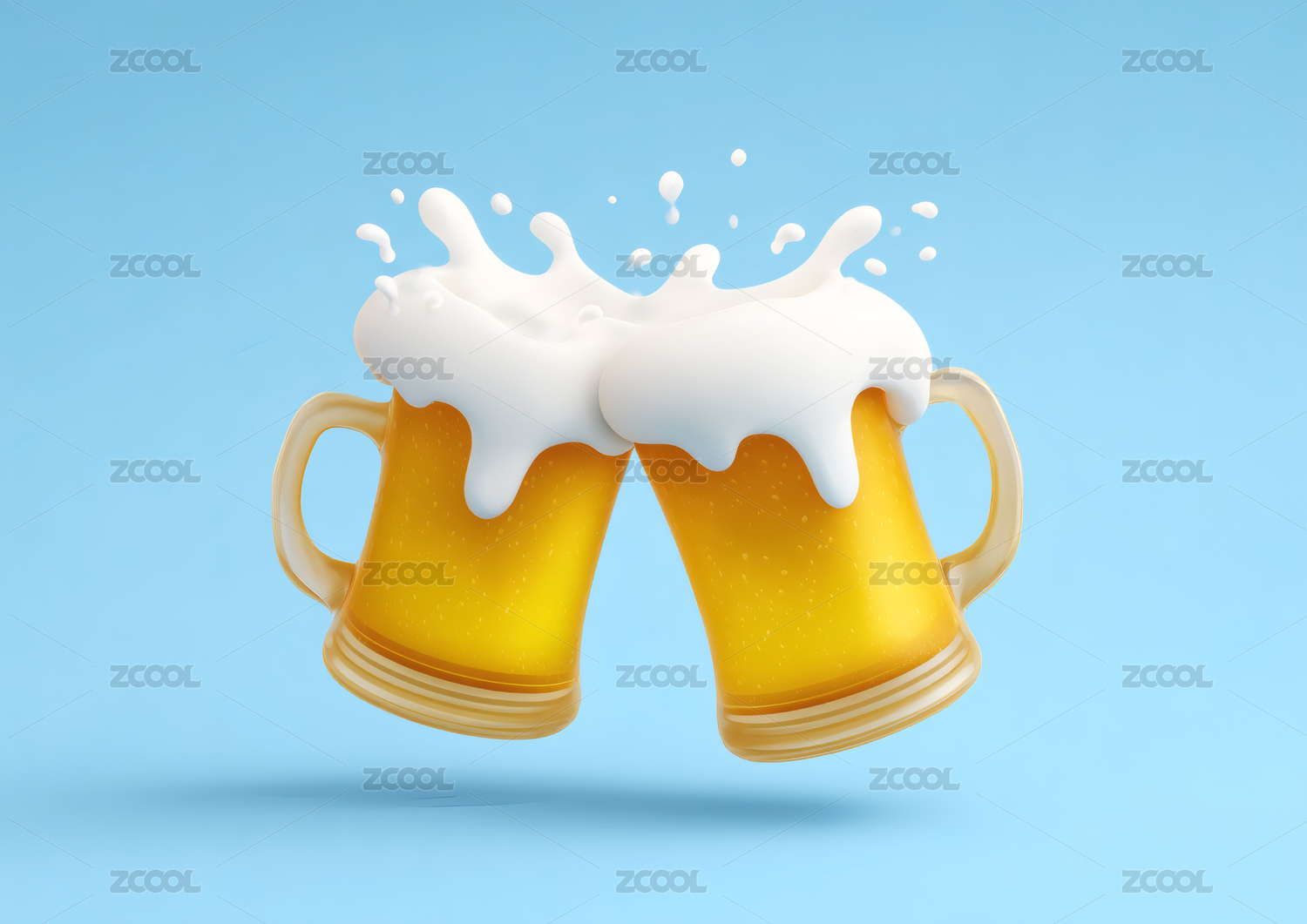 透明背景卡通风格3D啤酒杯,泡沫溢出