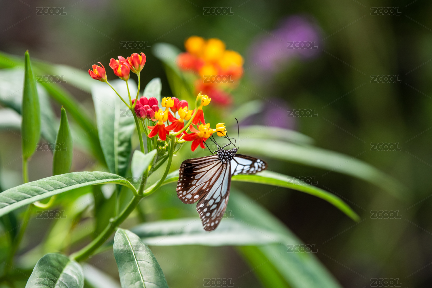 正在花丛中授粉的白色斑纹黑蝴蝶