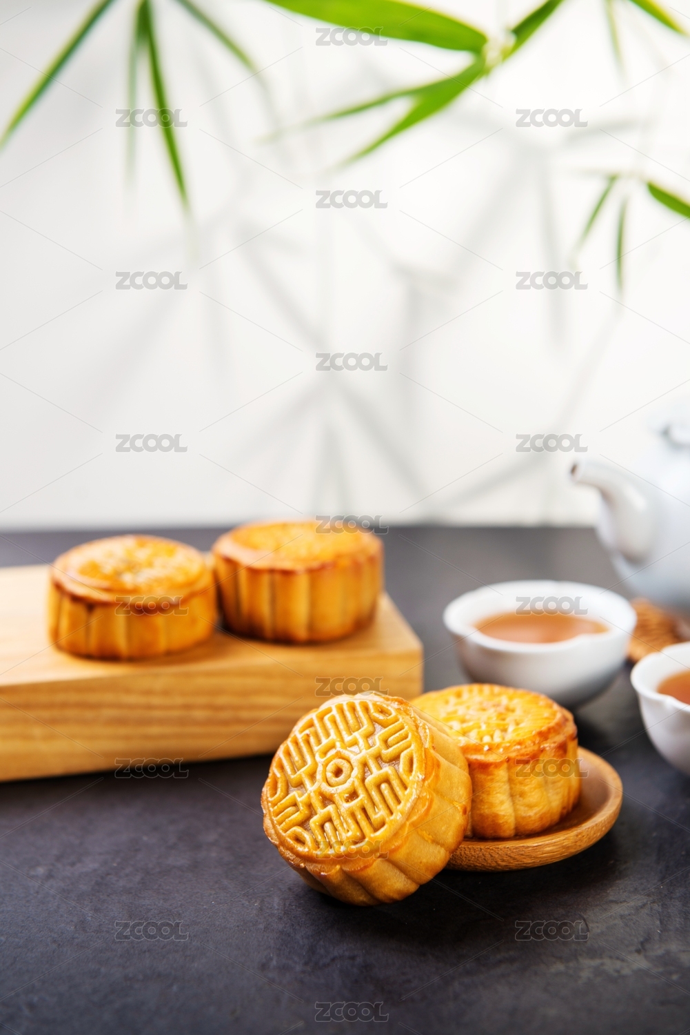 中国中秋节美食,水泥质感背景的月饼和茶水