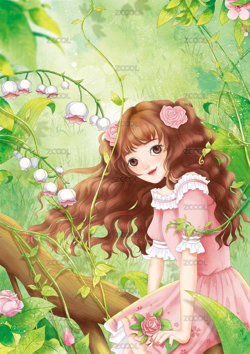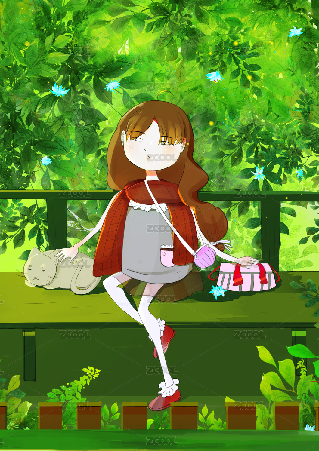 插画,深夜,女孩,书,咖啡,草丛,树林,路灯,小清新,快乐