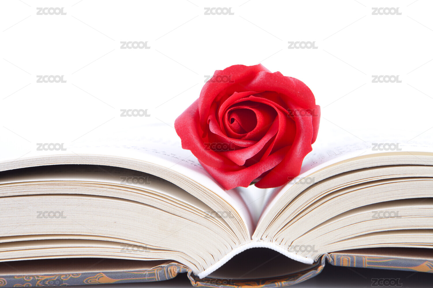 一本打开的书本上放着一朵粉红色的盛开的玫瑰花