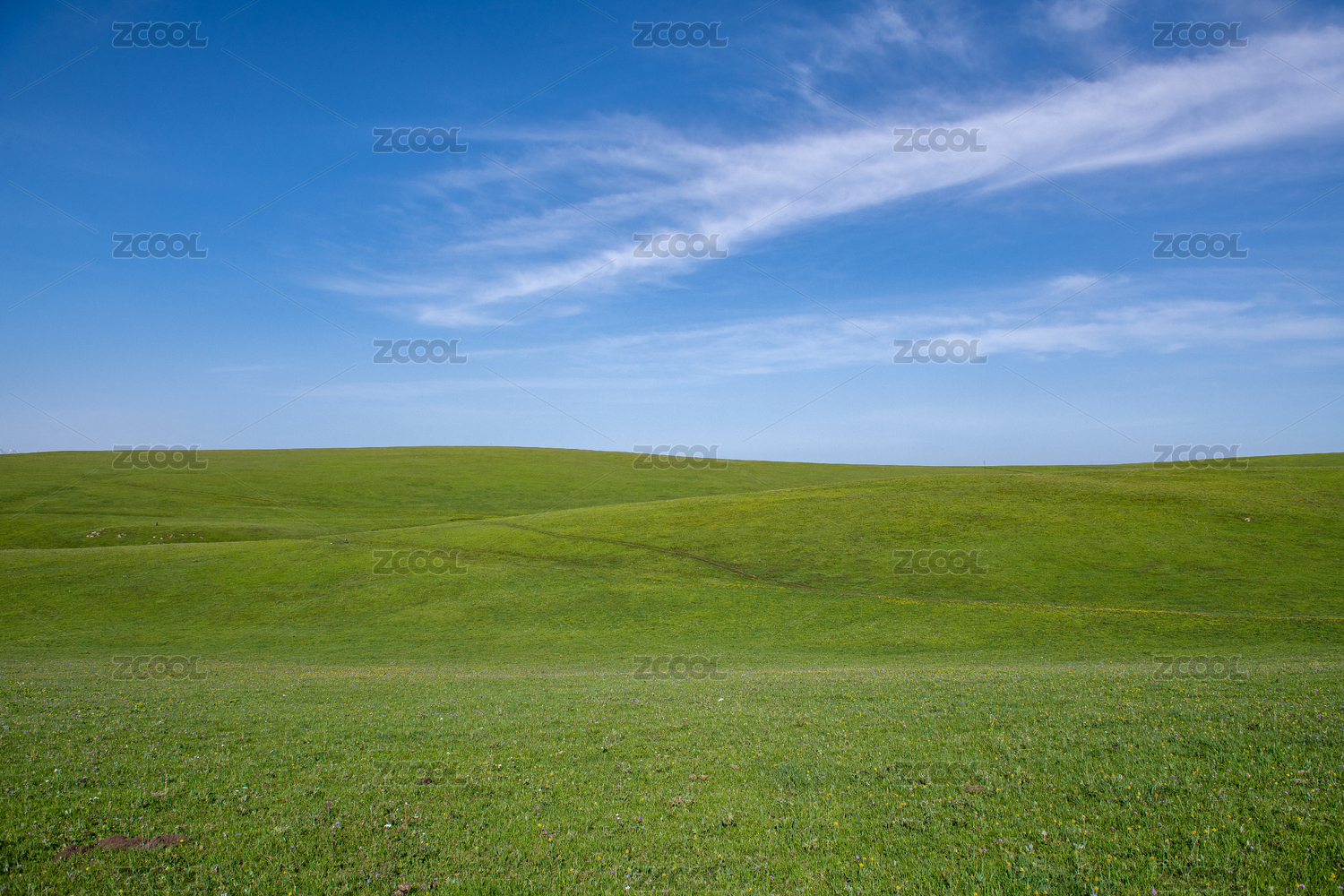 中国新疆夏季晴天蓝色天空下绿色的大草原