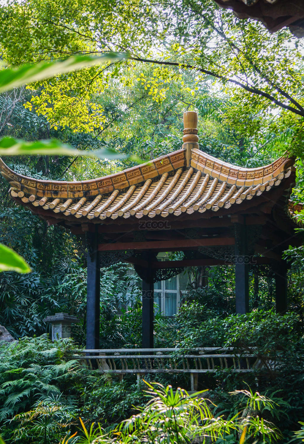 广州公园里绿树环绕的中式凉亭