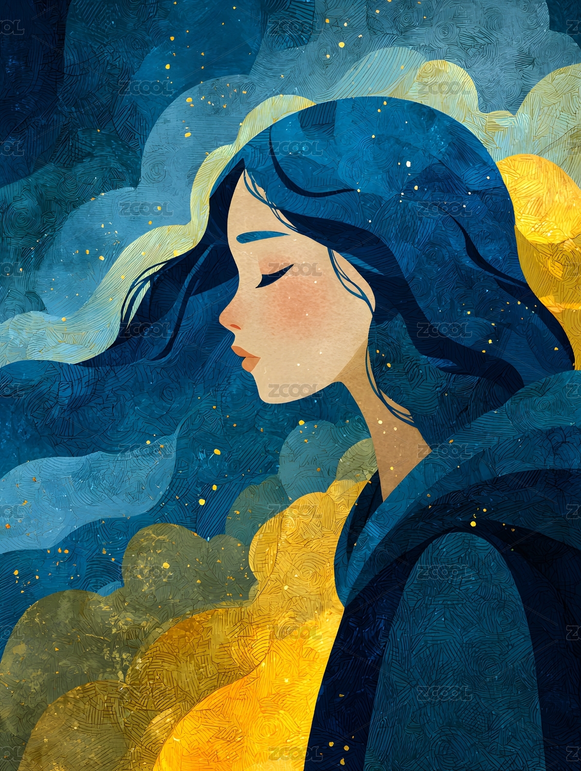 插画,绘本,紫色,梦幻,星空,女孩,儿童,流星