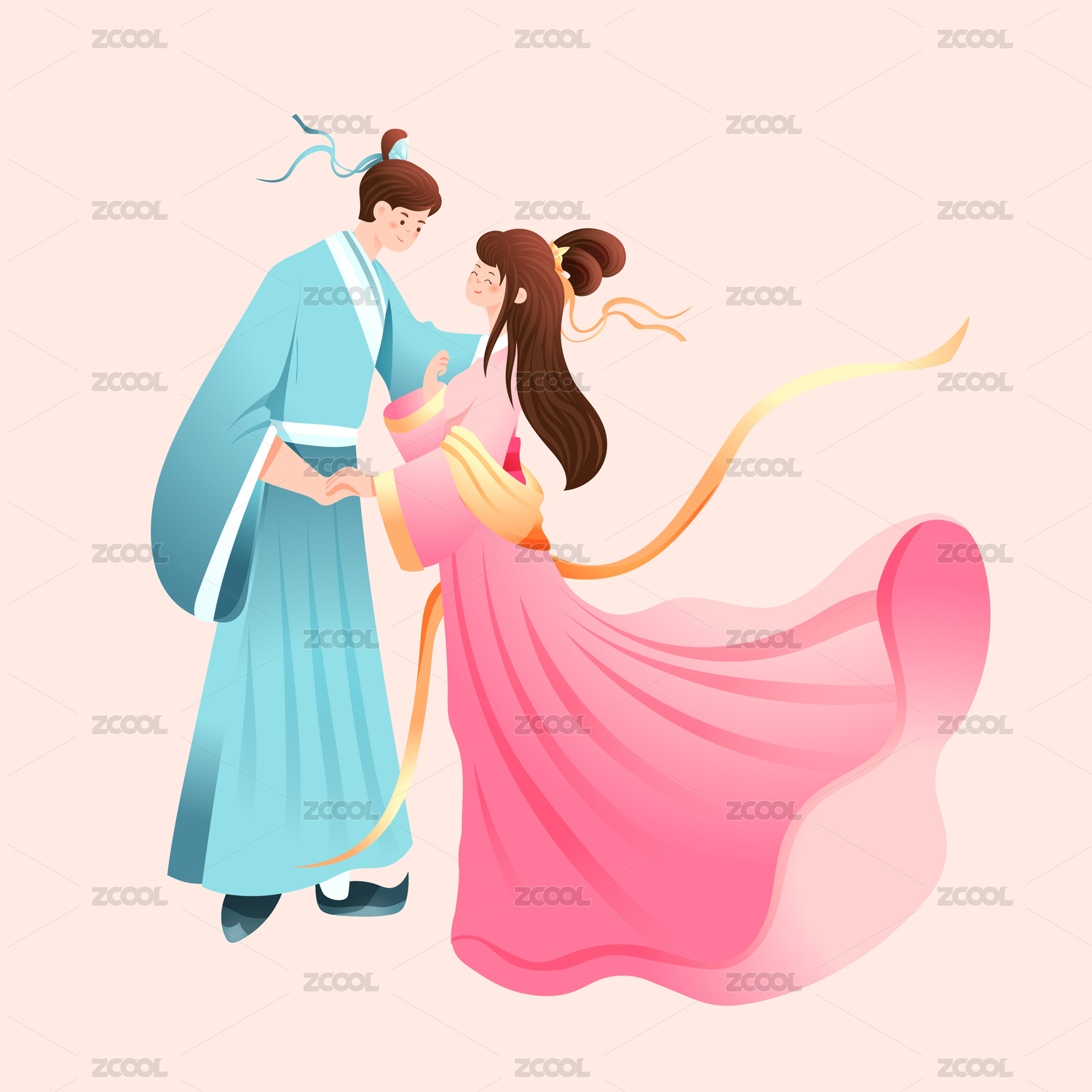 七夕情人节牛郎织女甜蜜相会矢量元素插画