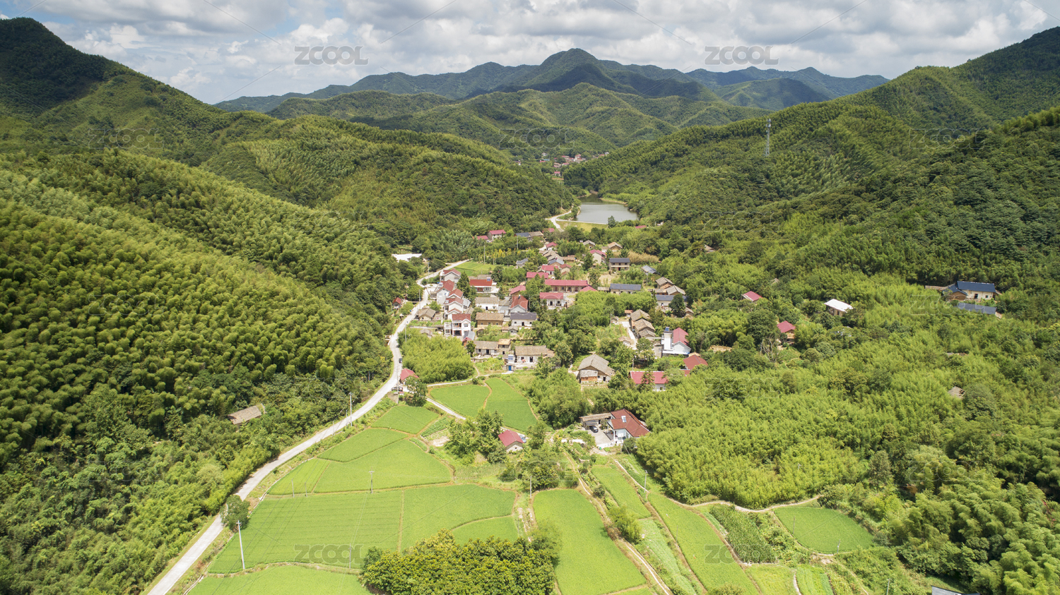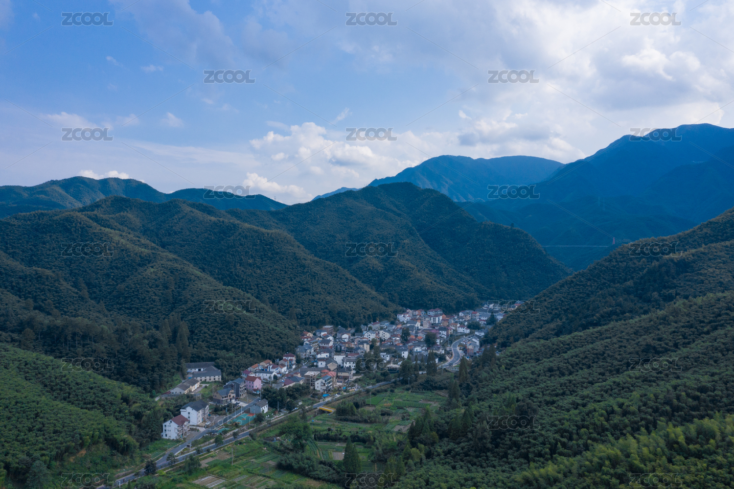 航拍浙江湖州山谷与村庄