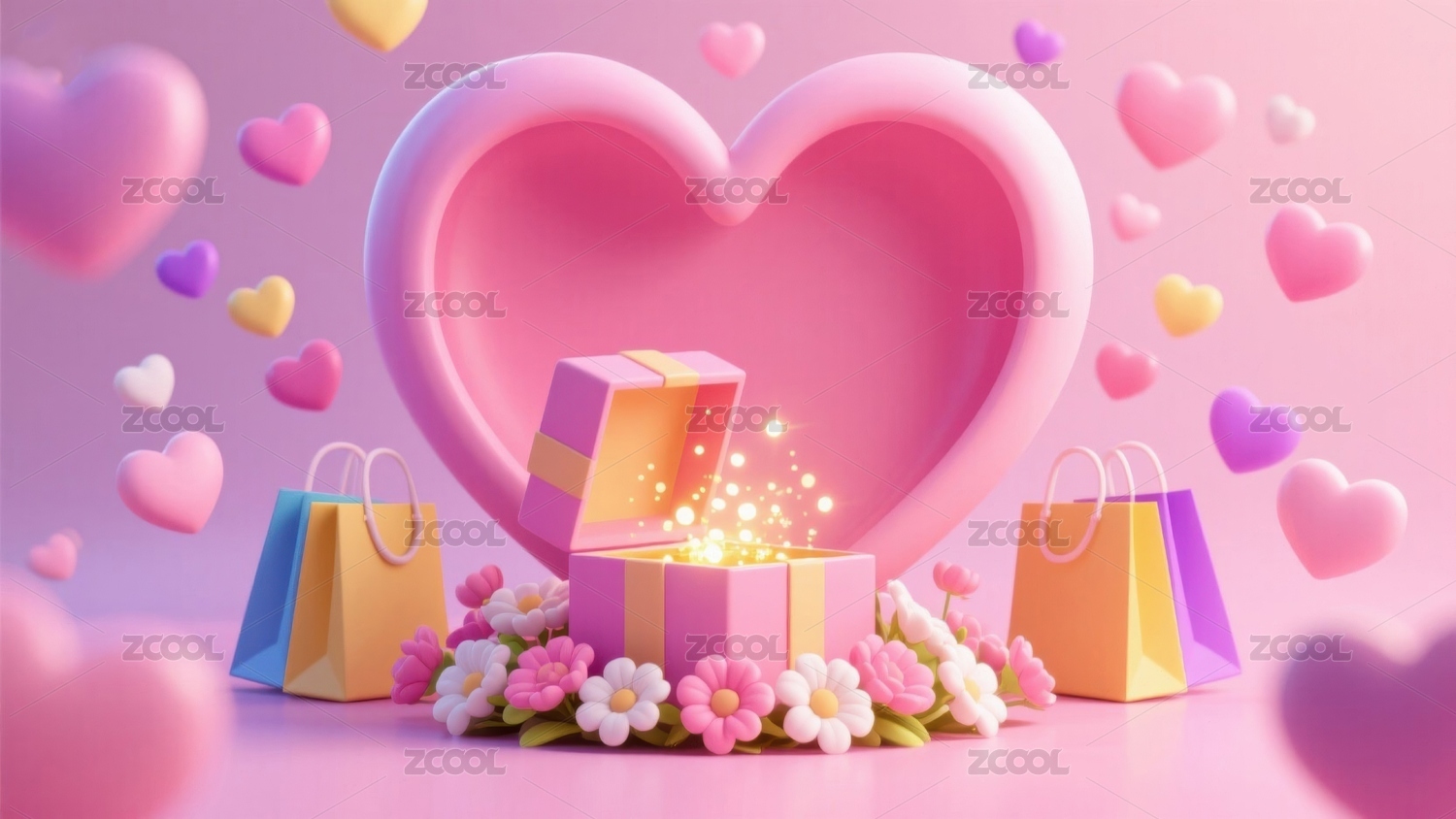 粉色背景上的爱心气球和购物袋庆祝情人节