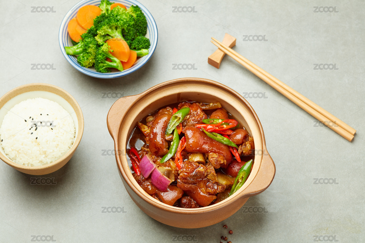 放在黑色托盘上的中国广东美食——砂锅猪杂+白米饭