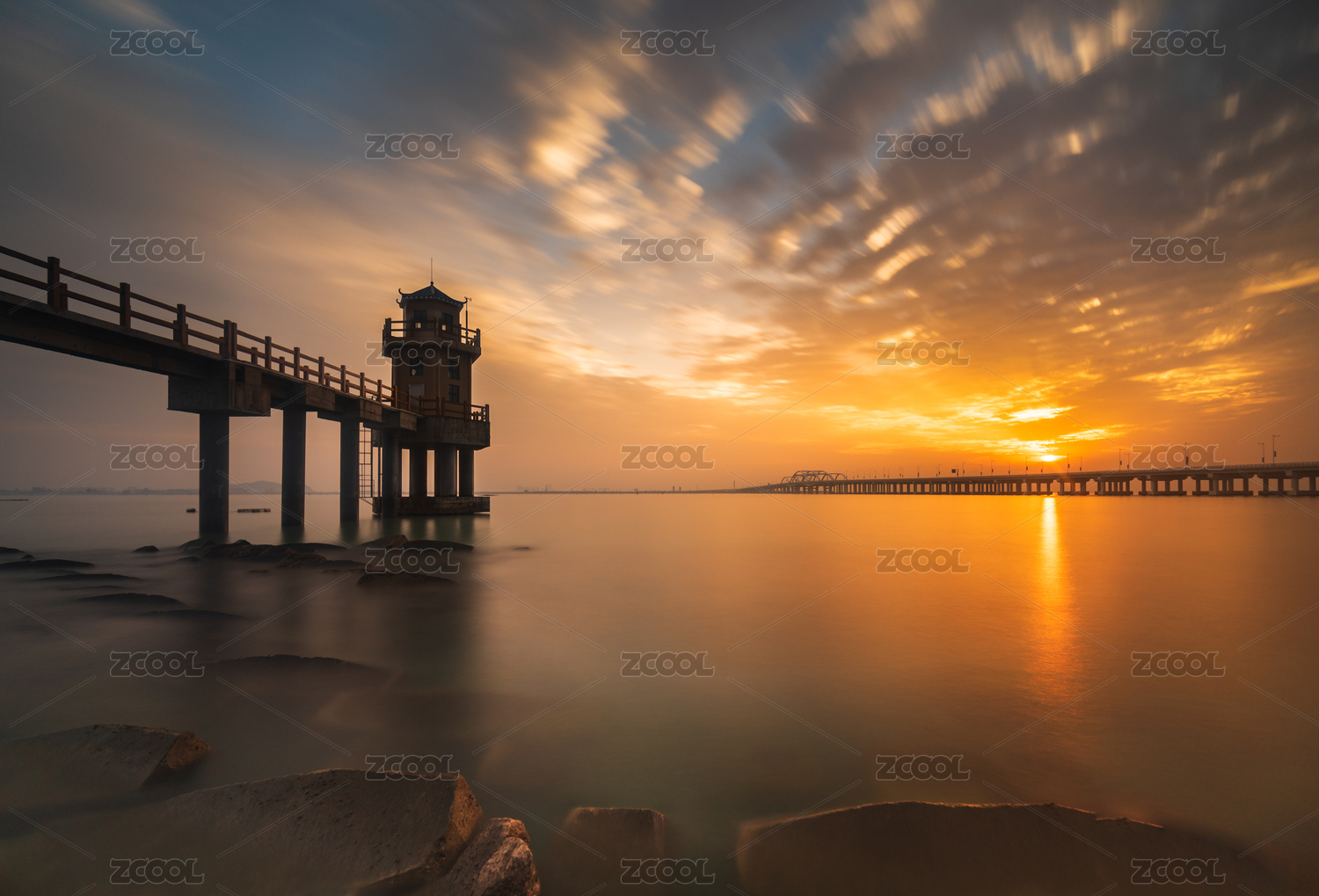 日落,海边,岩石,礁石,海水,大海,楼房,桥梁,黄昏,水雾