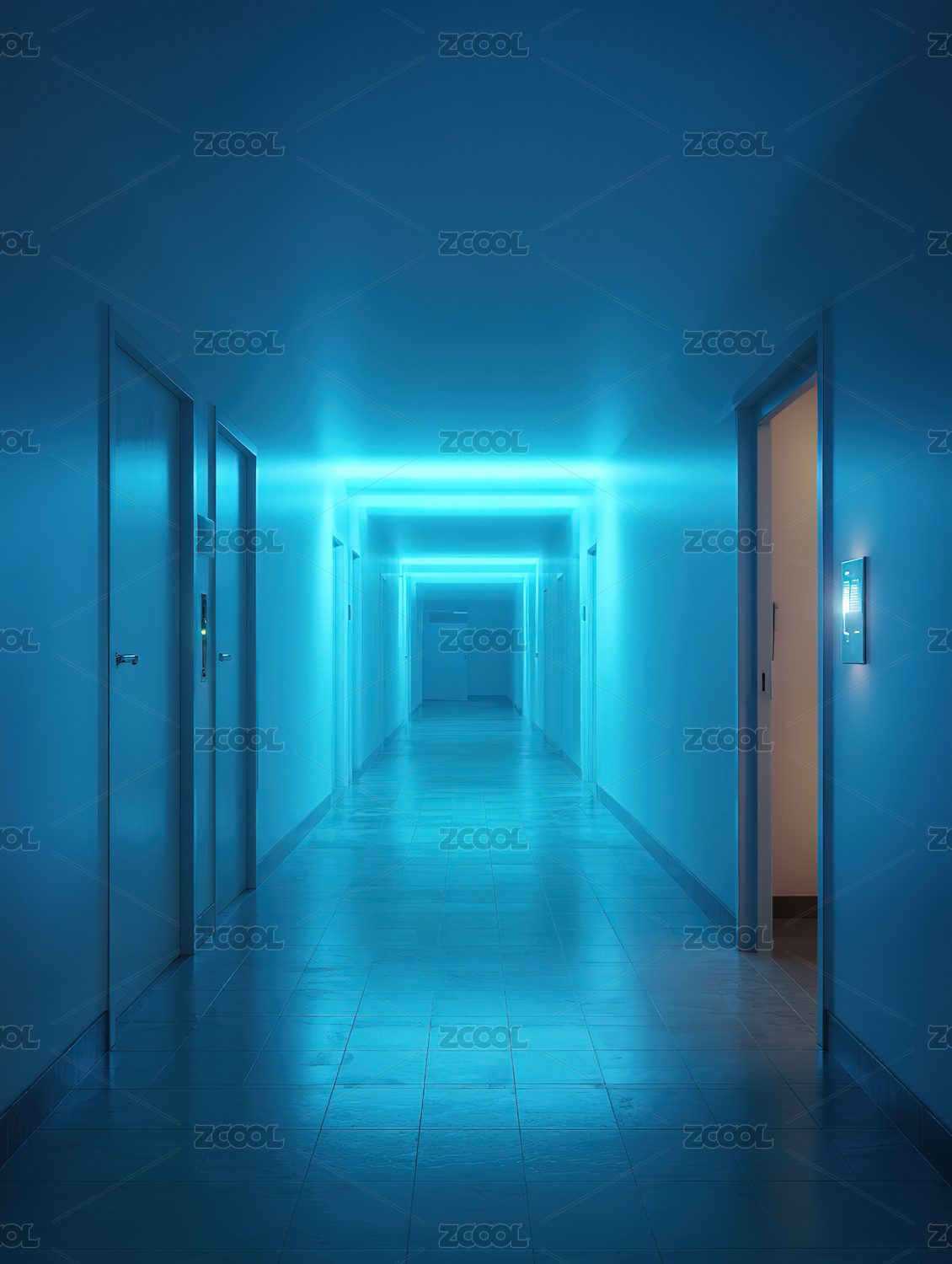 蓝色灯光下的空走廊
