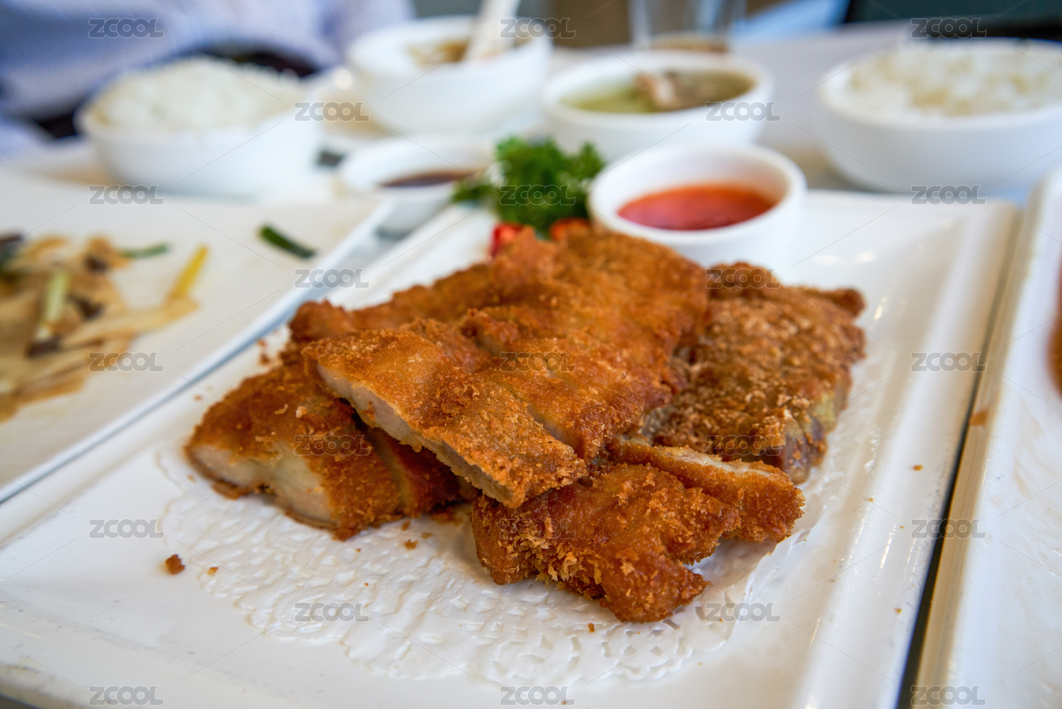 香港茶餐厅里的蔬菜照烧鸡排碟头饭
