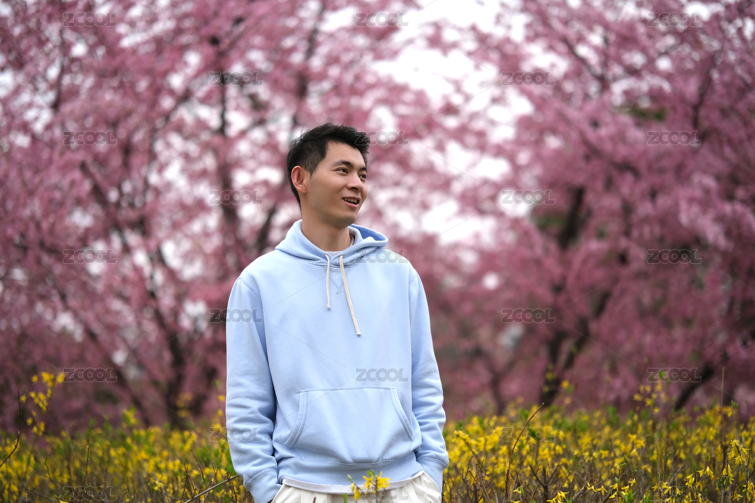 户外的年轻中国帅哥和模糊的粉红色樱花树