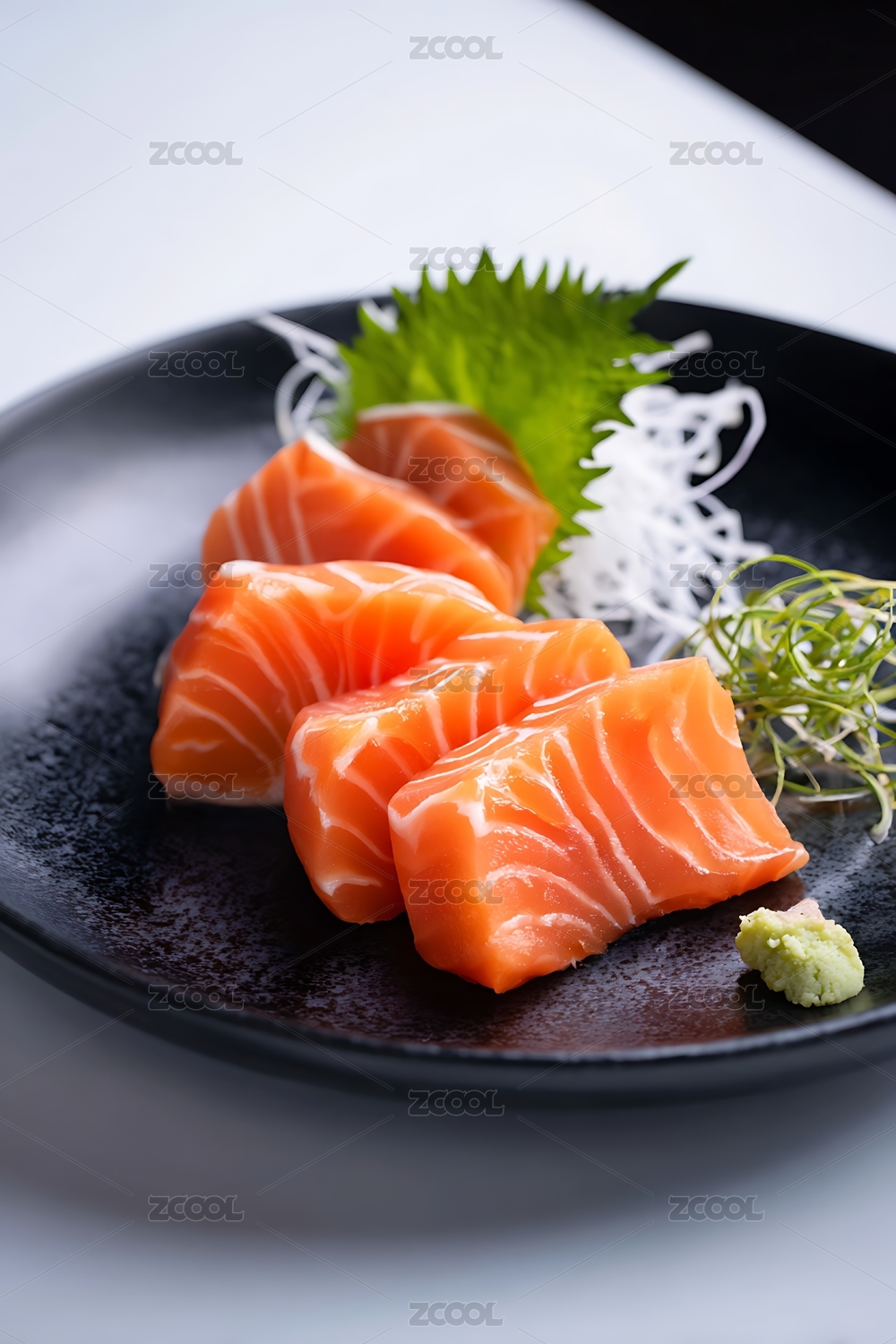 极品三文鱼刺身摆放在黑色鹅卵石上