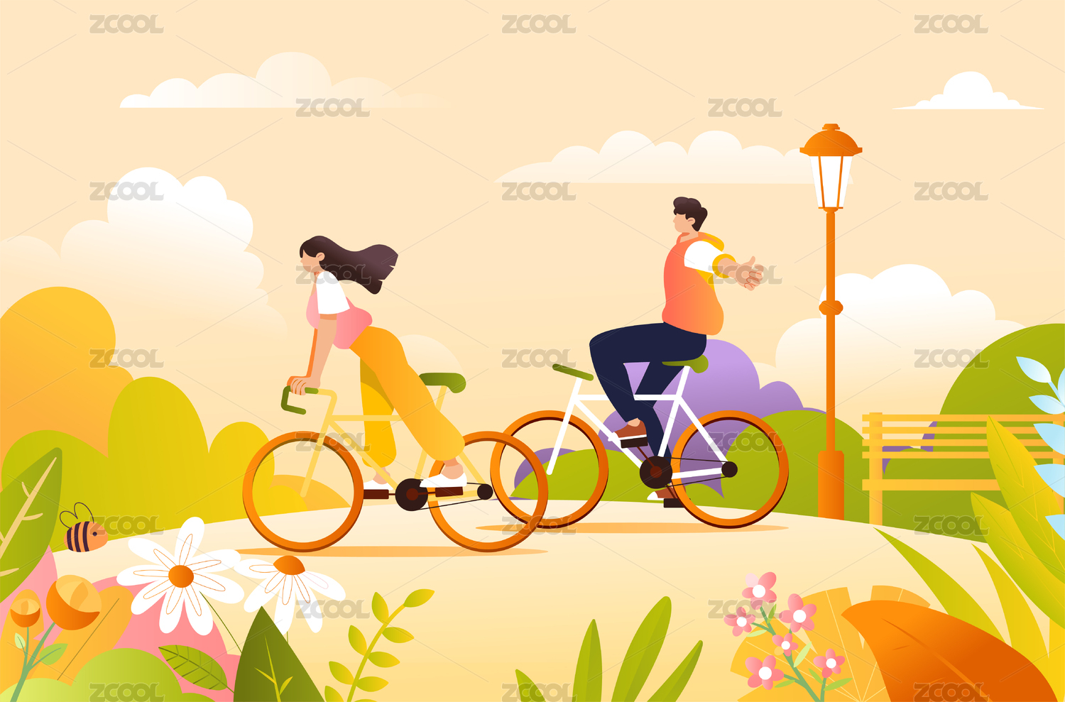 卡通立春出行踏青情侣骑自行车背景矢量插画