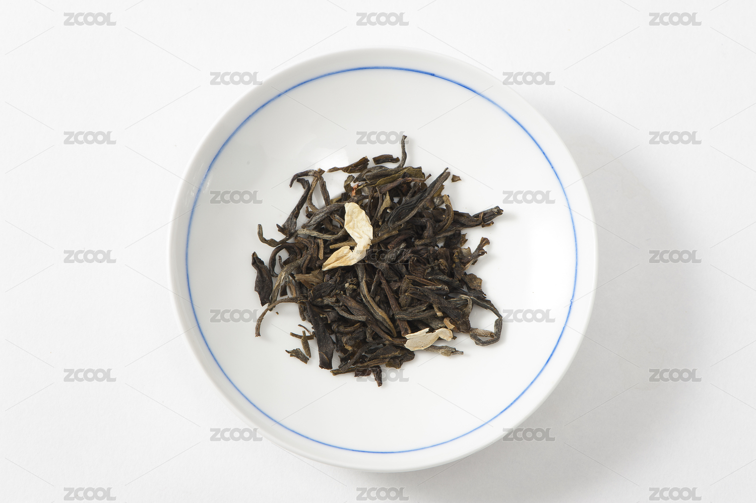 普洱茶生茶茶叶放在瓷盘里俯拍