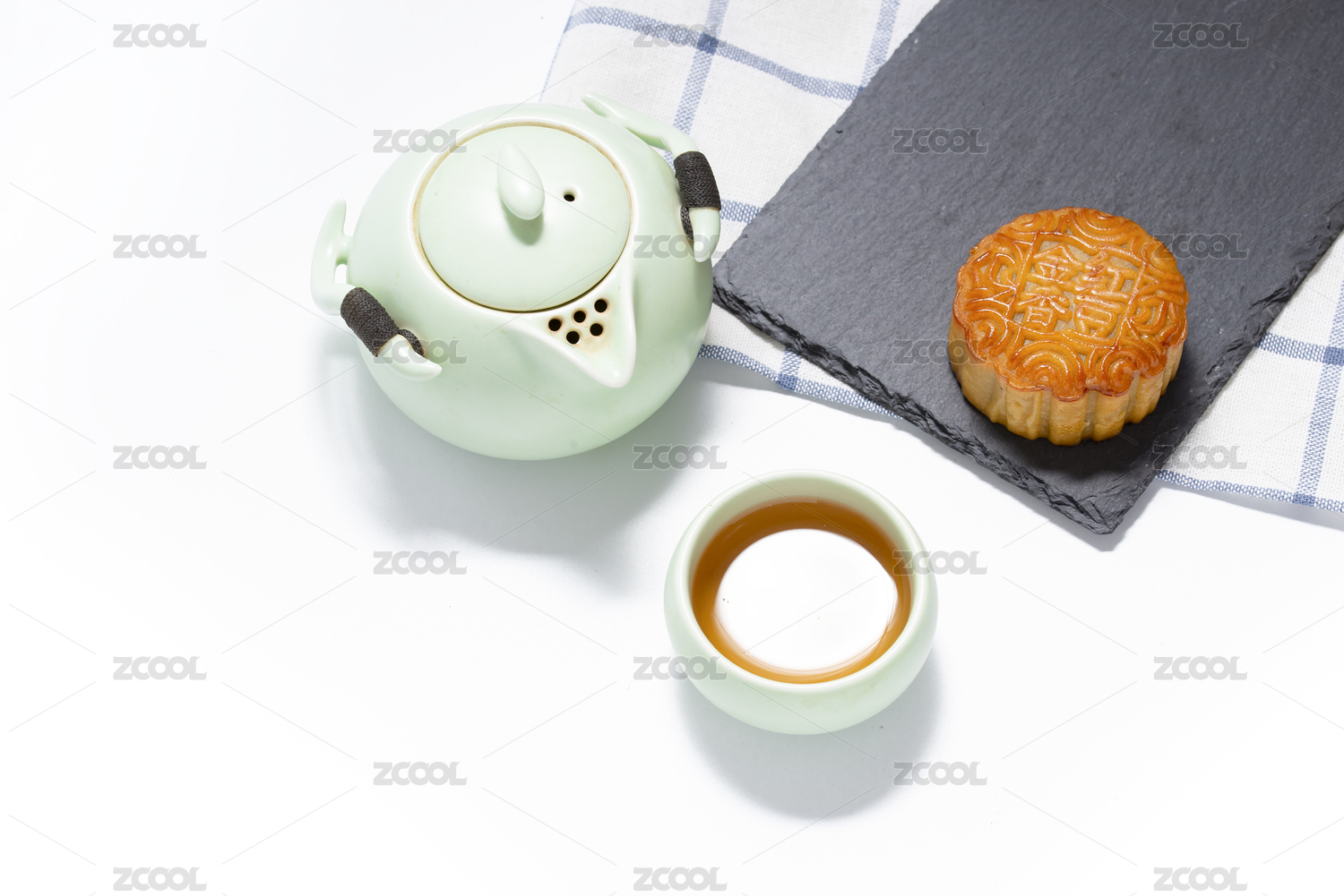 白底上一边摆放的月饼和青瓷茶壶茶杯