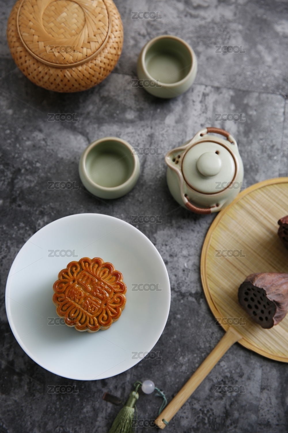 月饼茶壶茶杯及其他中式元素的规则摆放