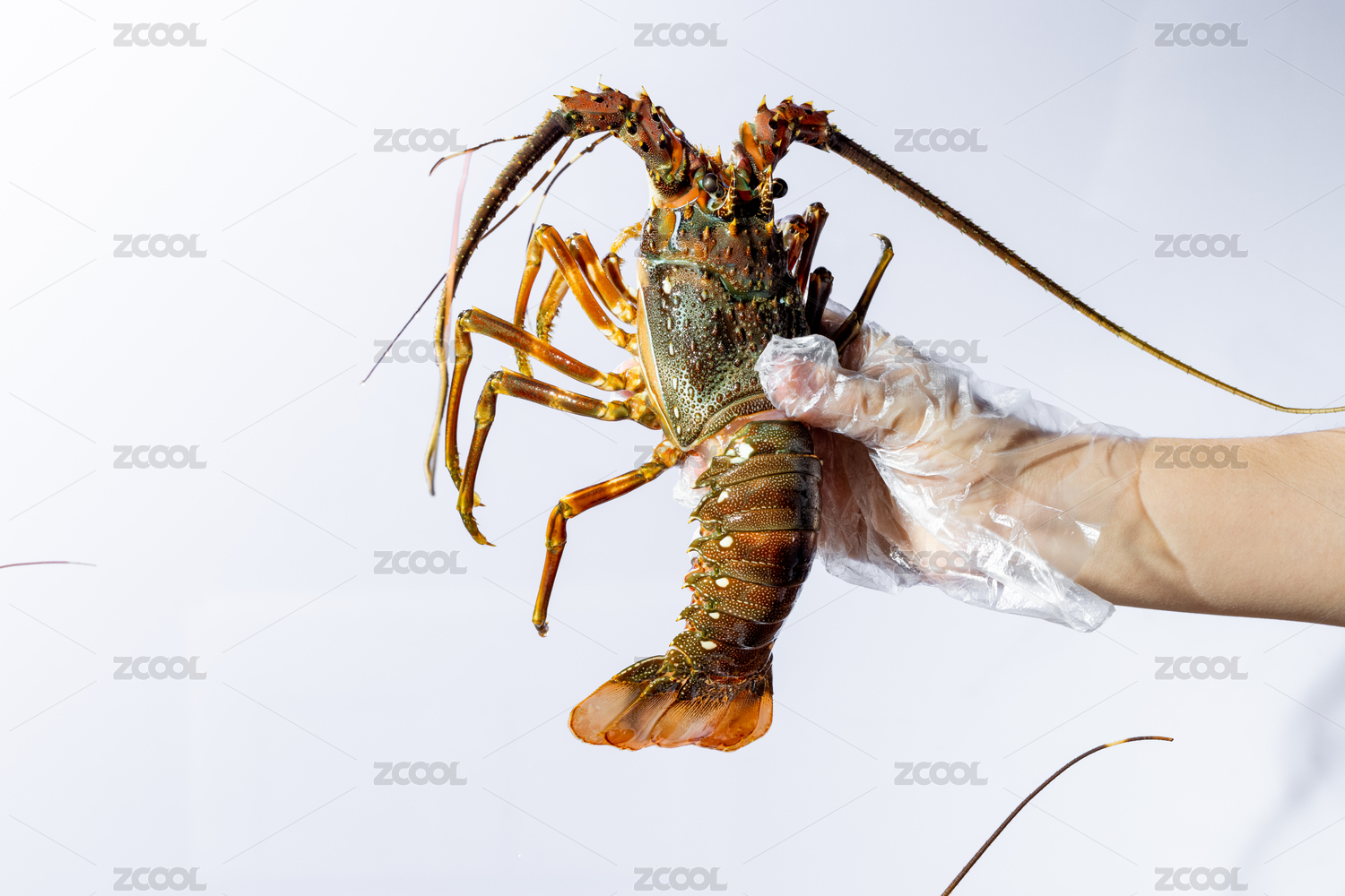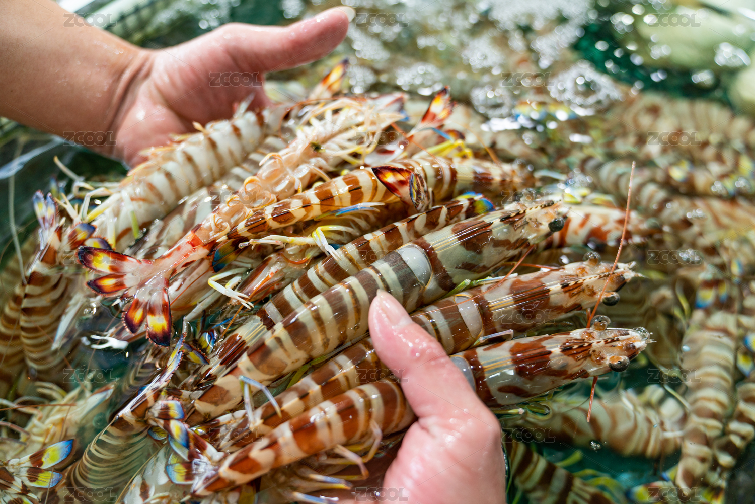新鲜捕捞的野生花虾,从鱼篓拿出来放在黑色的桌面