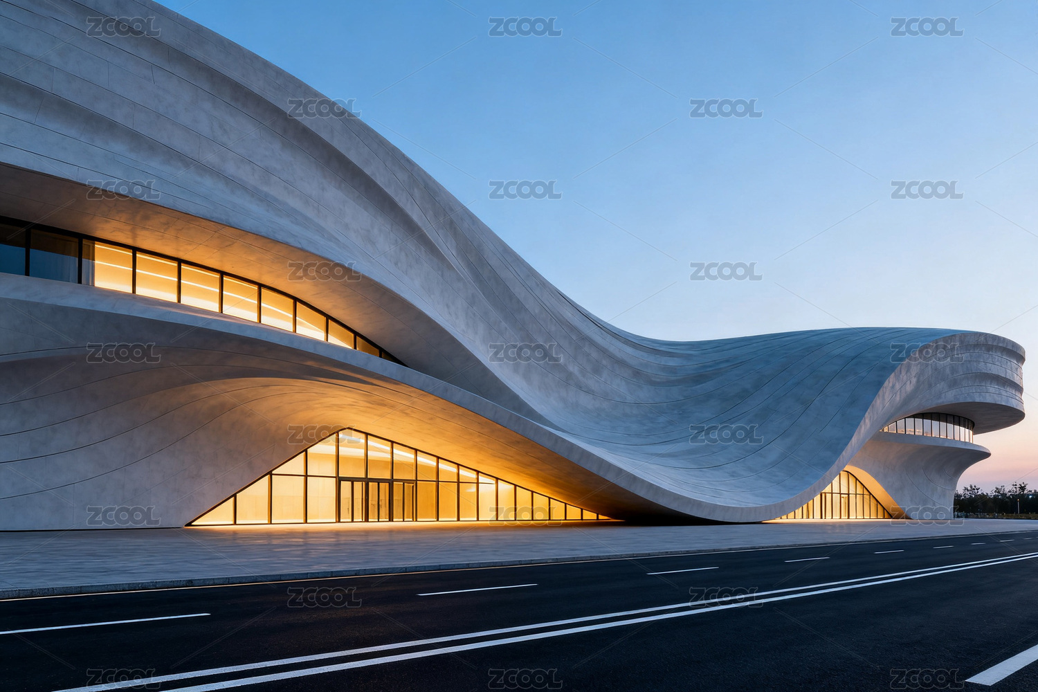 建筑主体,流线型设计,优雅,U形结构,白色,明亮灯光,未来,科技感,建筑,道路