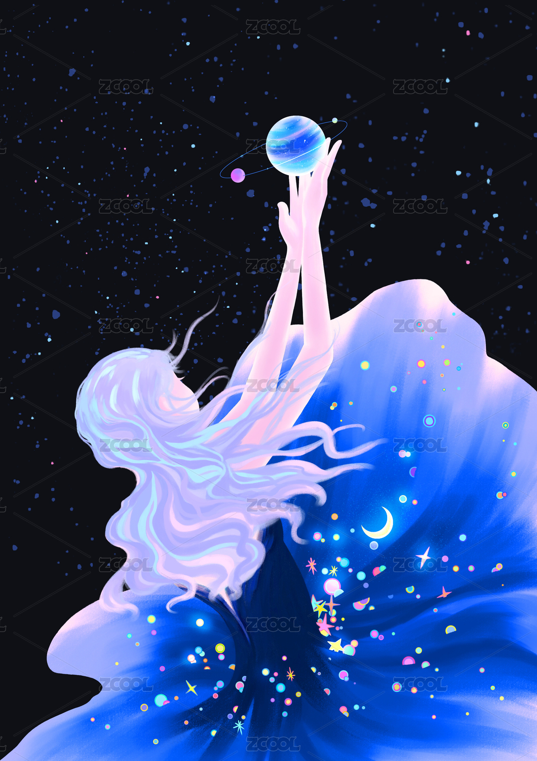 星空,星球,女孩,月亮,星星,梦幻,神秘,人物,小清晰,插画