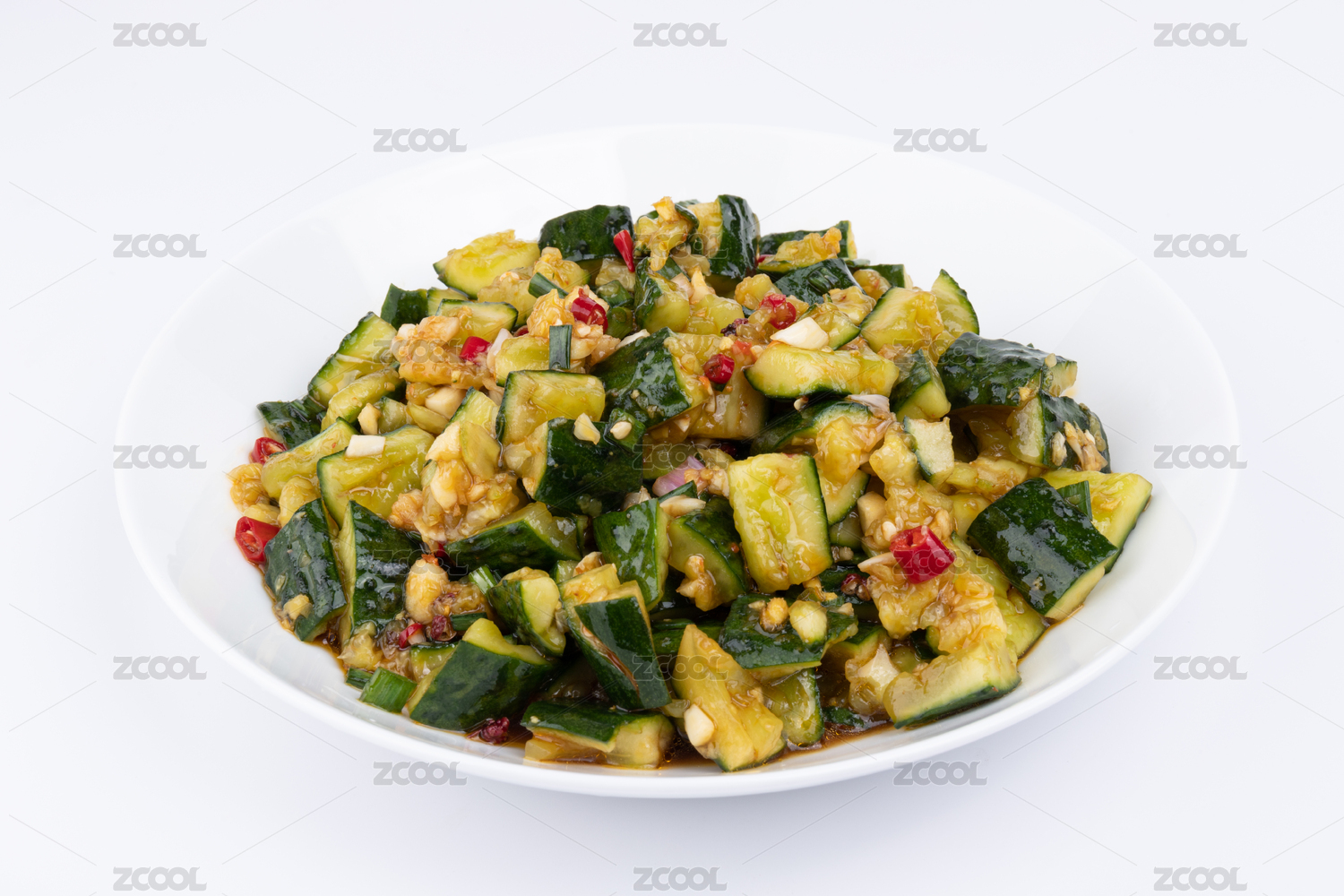 白色背景中的一盘凉拌青瓜