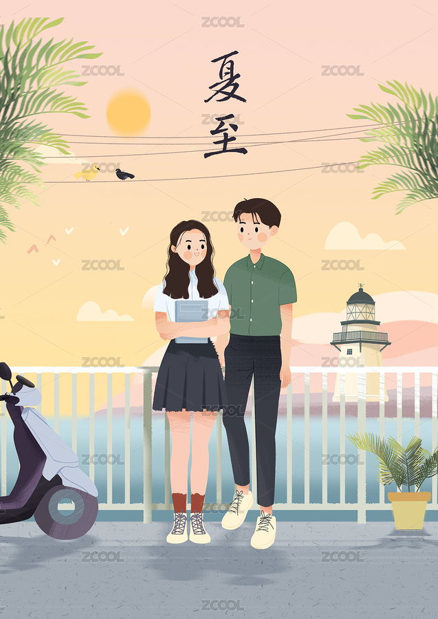 夏至情侣牵手看海上日出传统文化节气插画背景海报