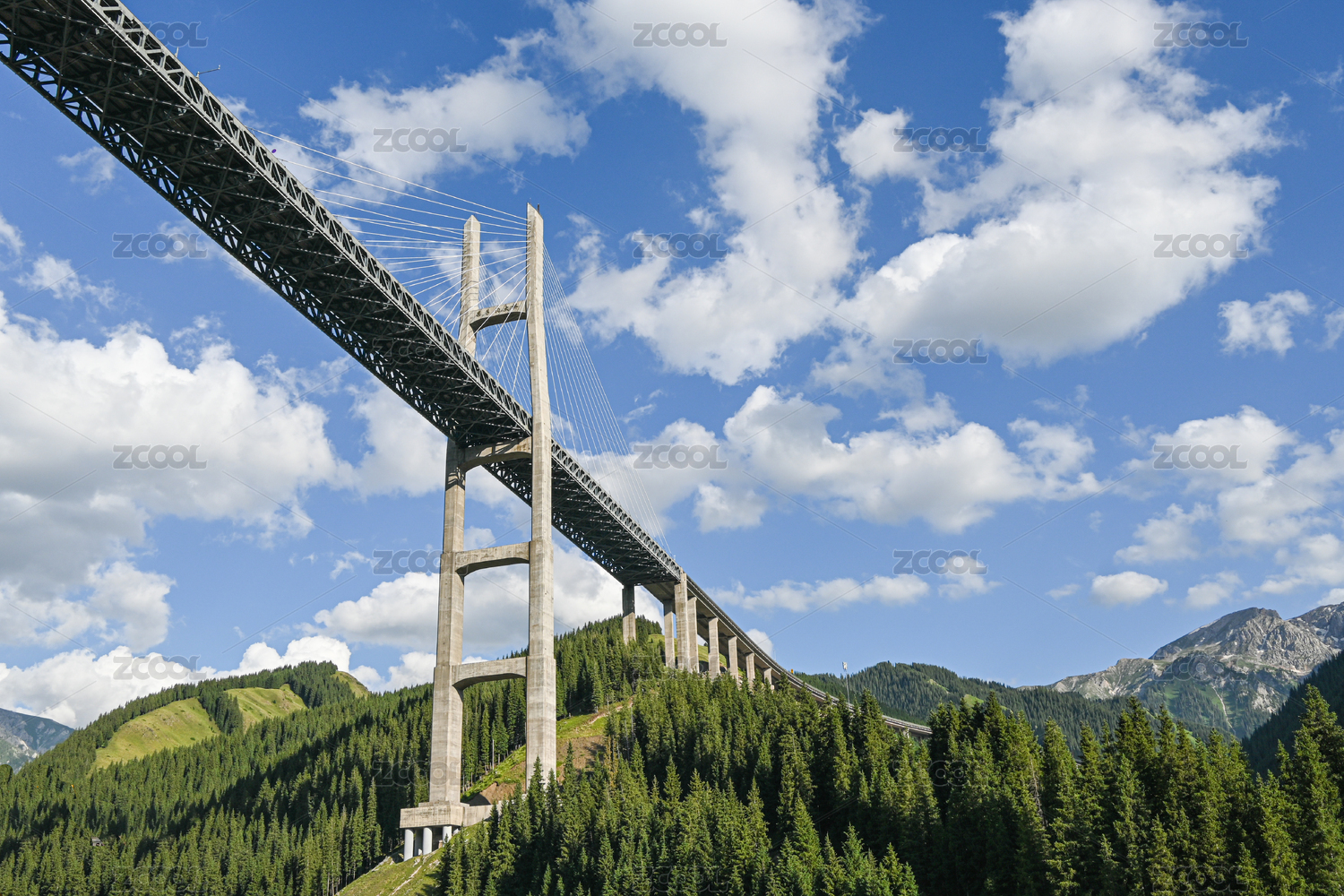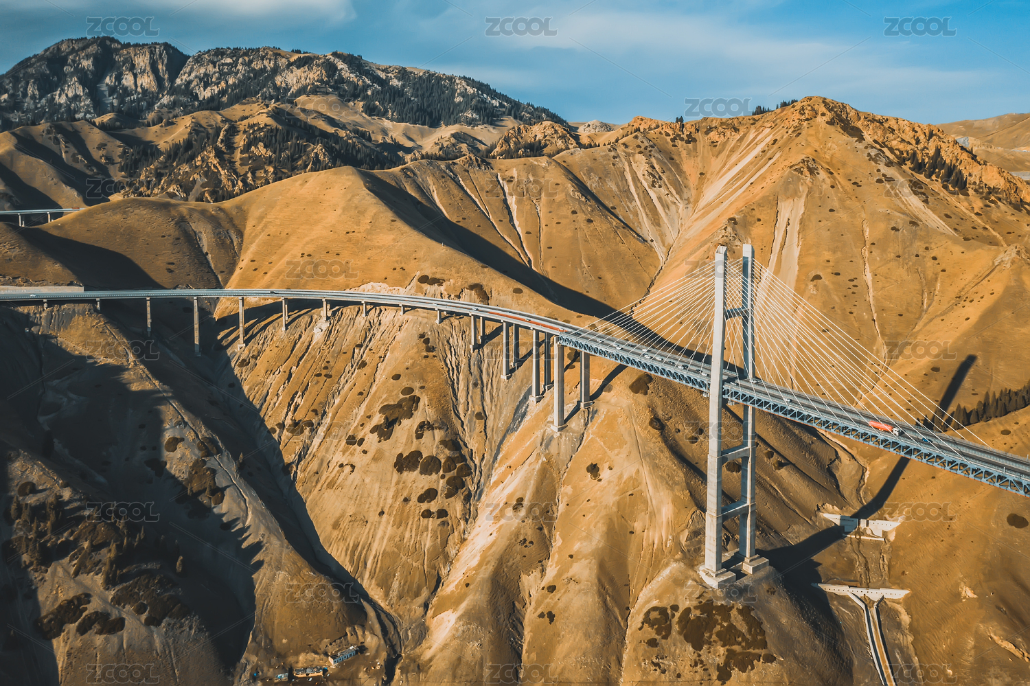 远看中国新疆伊犁群山密林中的果子沟大桥