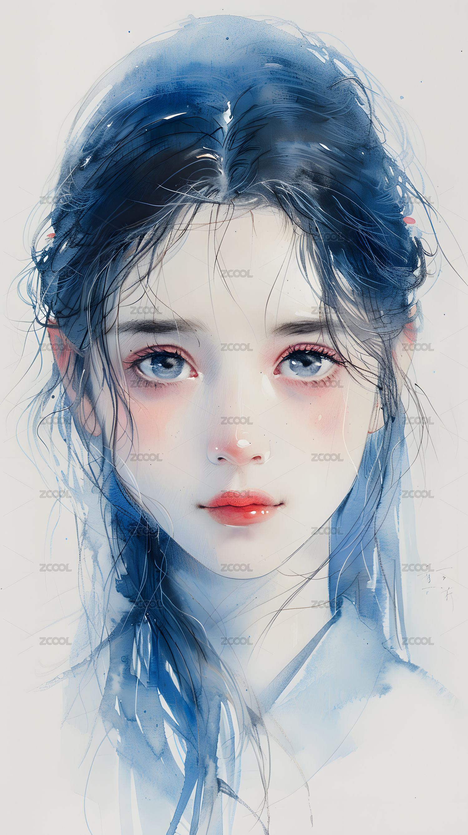 蓝色水彩画风少女肖像