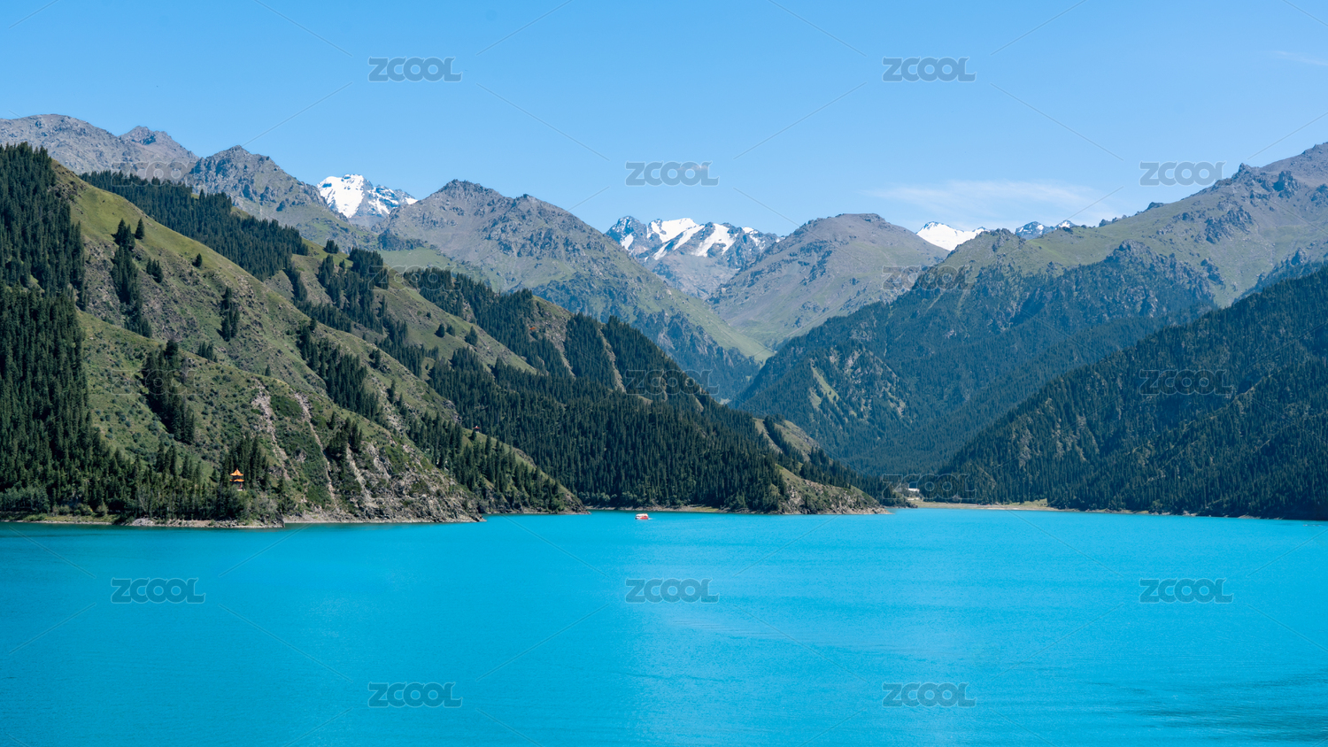 中国新疆天山天池 蓝色的天空与湖水呼应