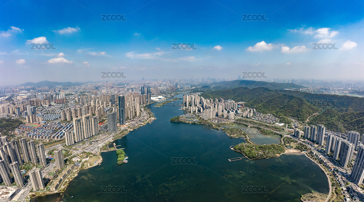 梅溪湖,长沙,城市,航拍,玻璃幕墙,高楼,梅溪湖城市岛,水面,蓝天,白天