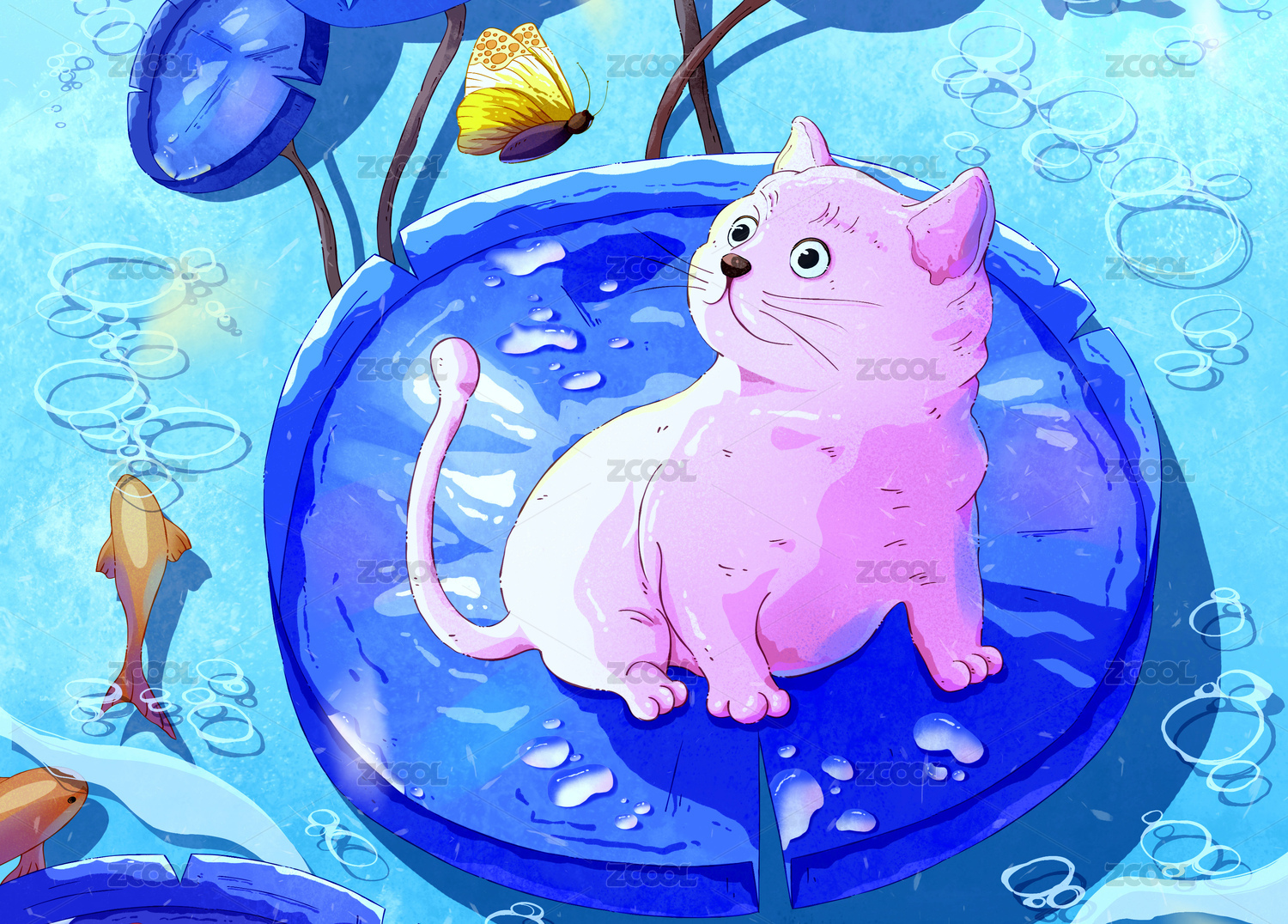 鱼儿游动的夏天荷叶上猫咪与蝴蝶插画