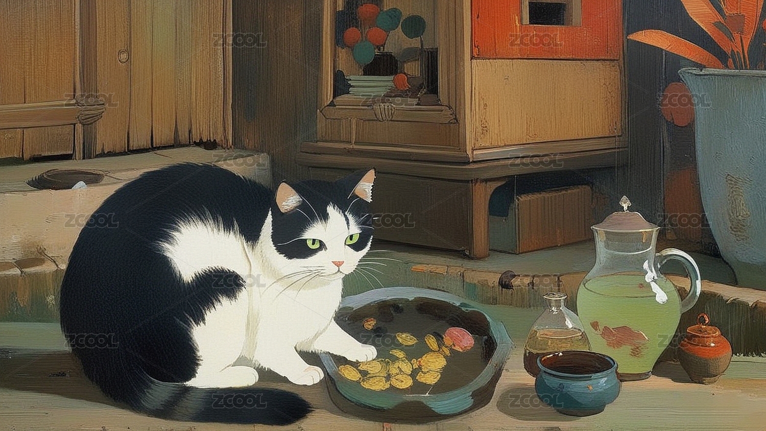 夏天女孩和猫猫在屋里吃西瓜吹电风扇