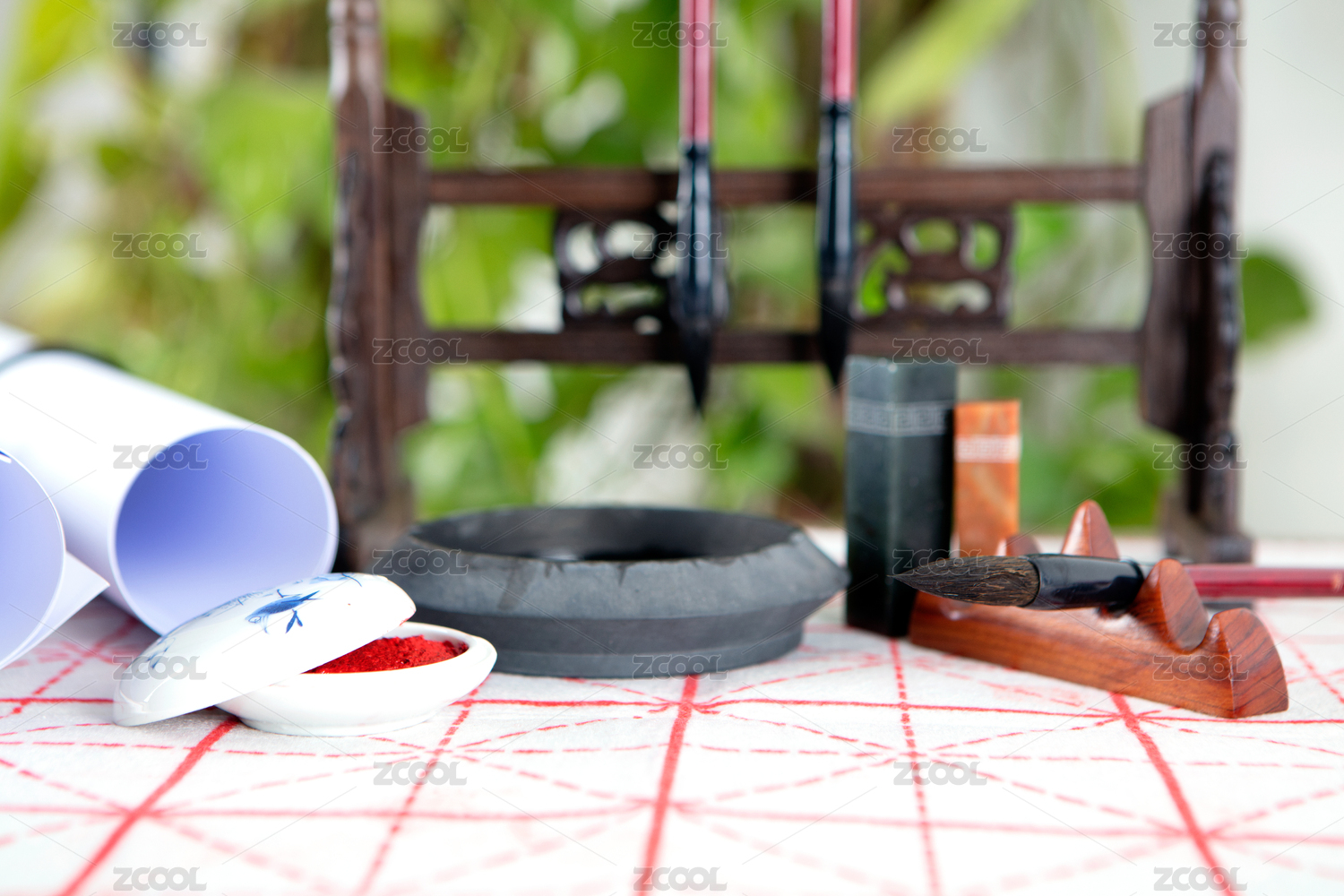 笔托上放着毛笔及旁边的印章和砚台