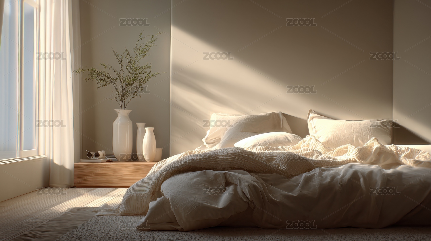 阳光洒进奶油风卧室窗景清新