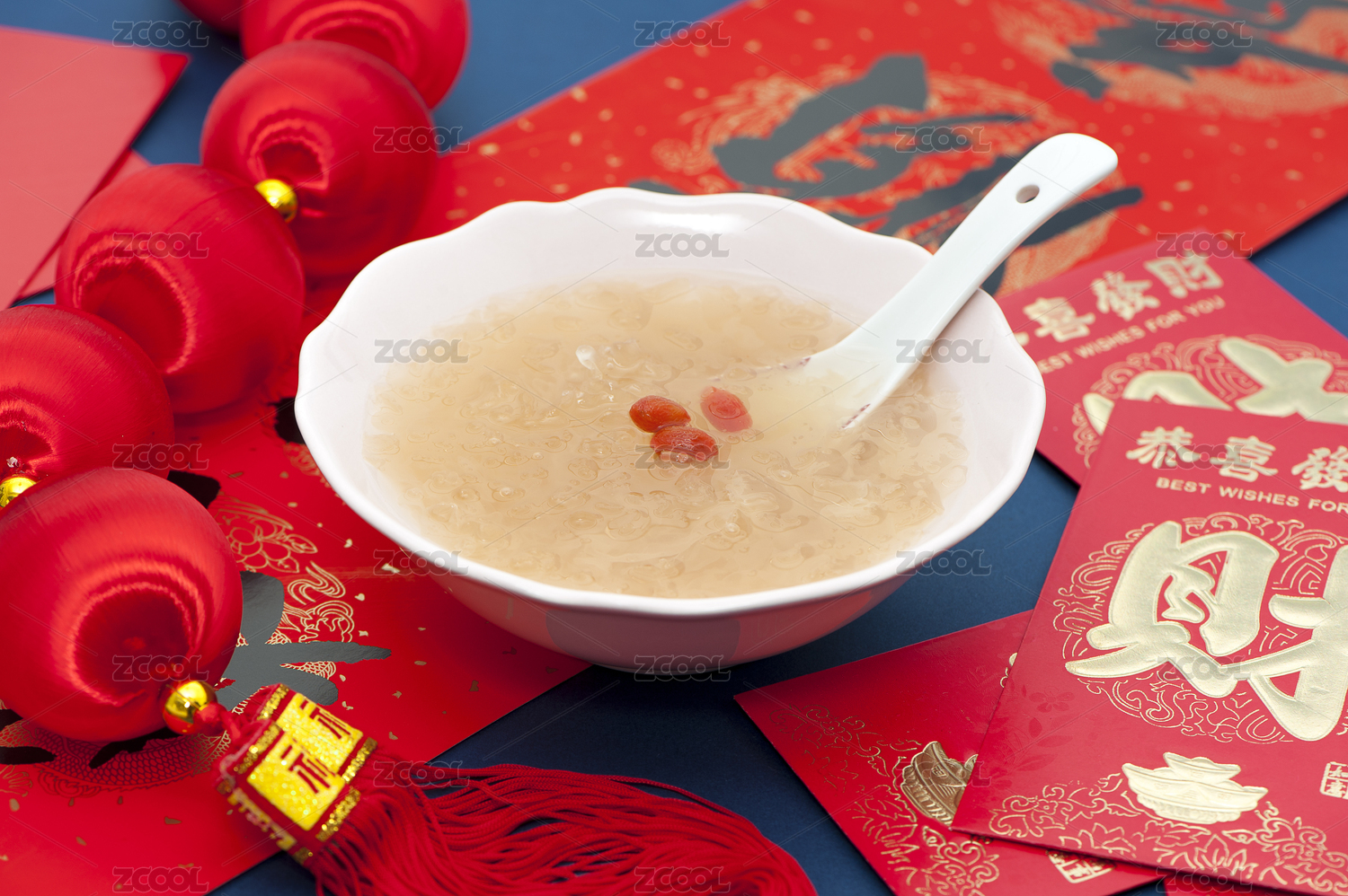 喜庆红背景上的盖碗茶和盛着汤圆的勺子