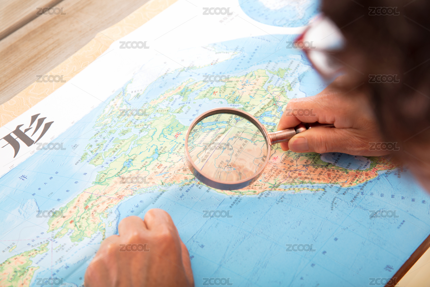 一只手拿着铅笔另一只手拿着放大镜在地图上找寻