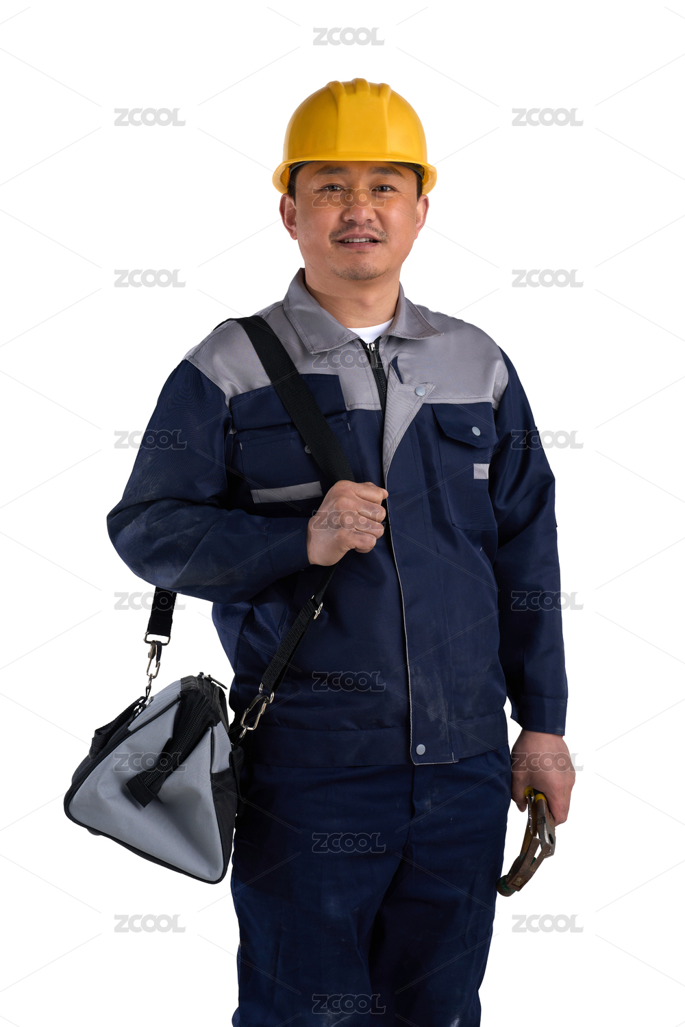 建筑行业的建筑工手拿黄色安全帽站在白背景前