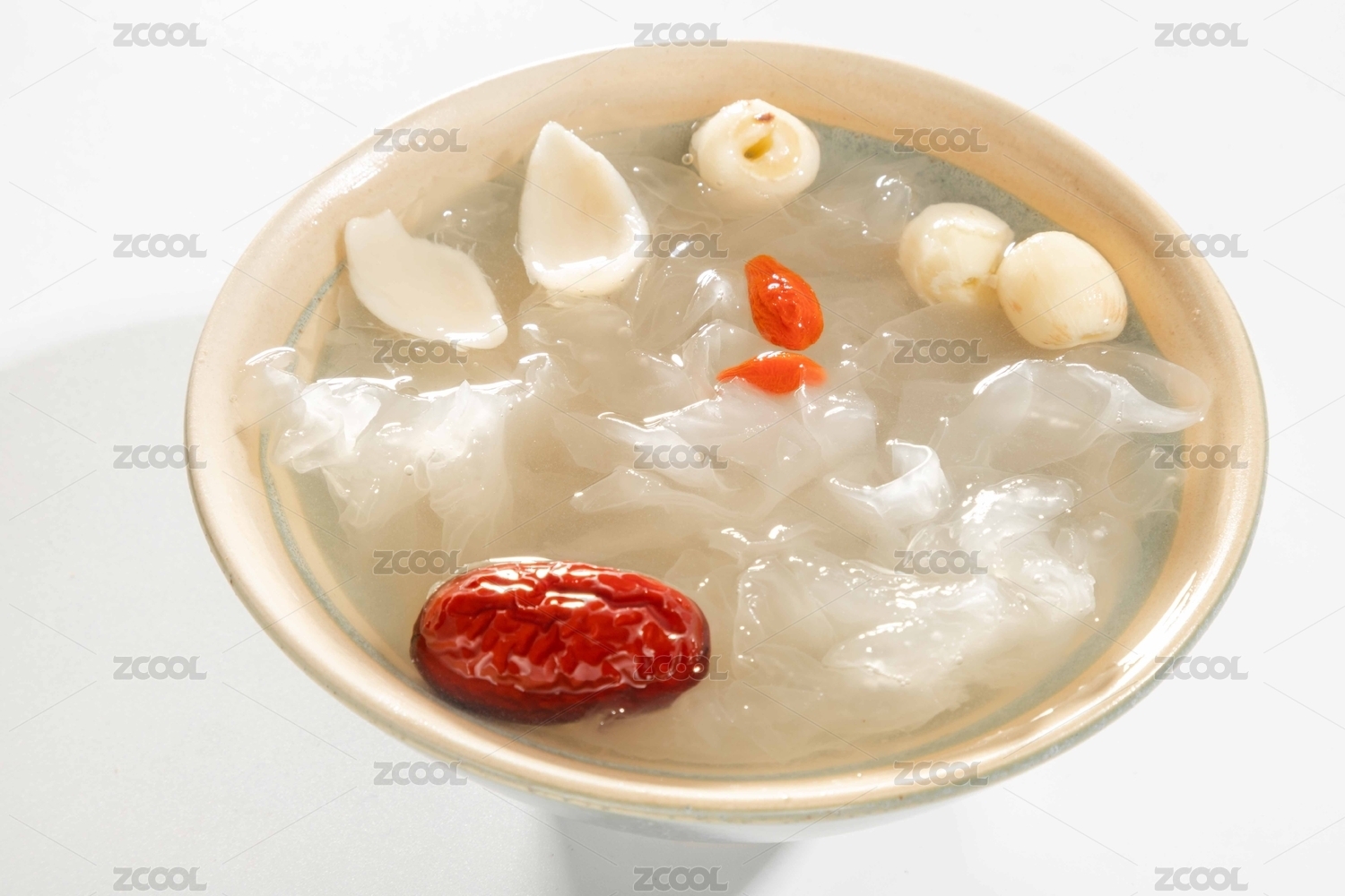 白色背景上红枣莲子银耳羹
