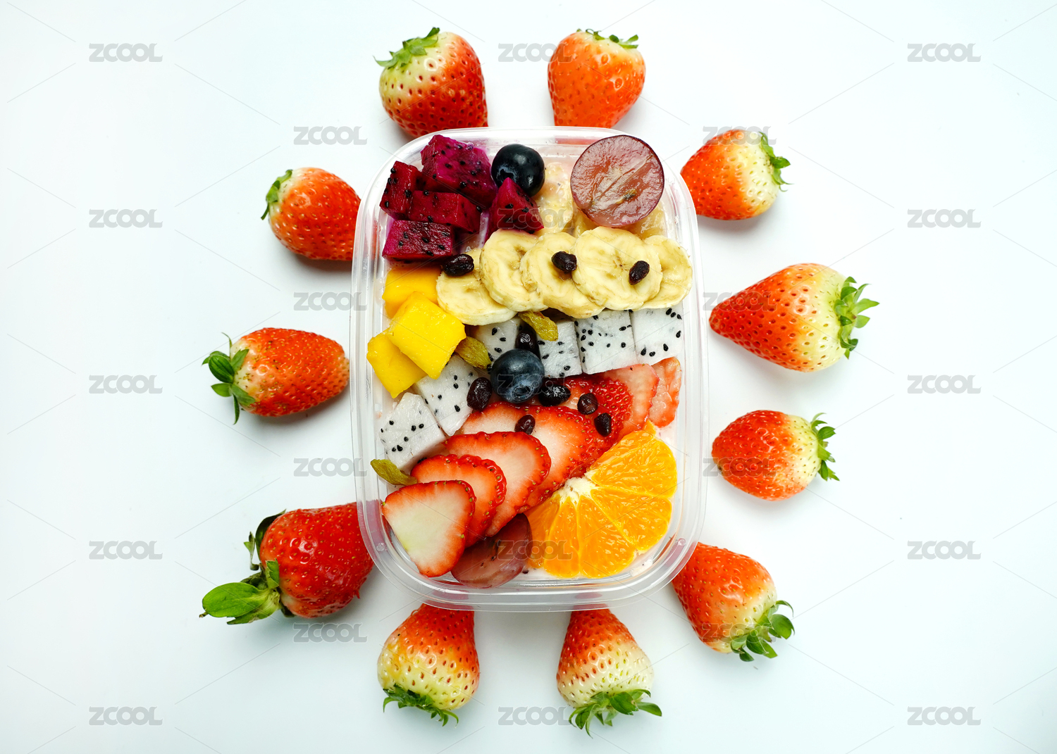 白色背景上餐盒里盛放的水果捞