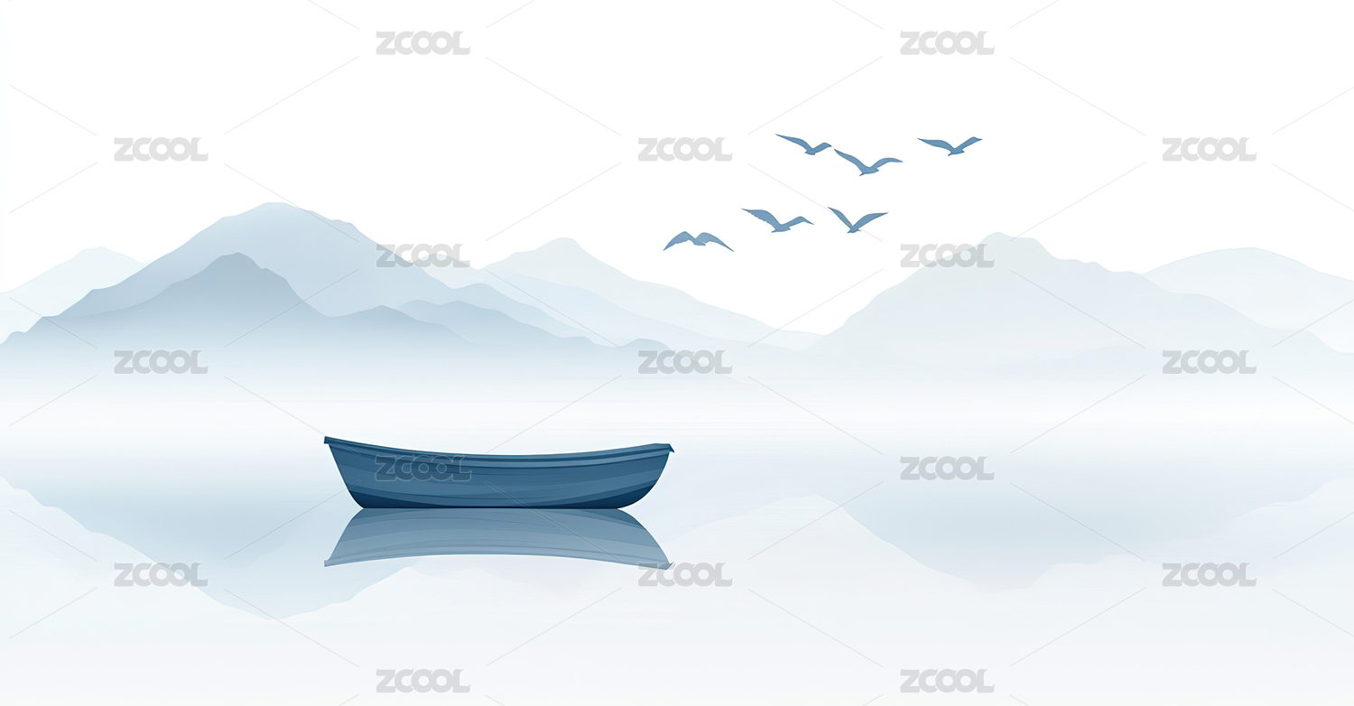 宁静湖面山景小船飞鸟