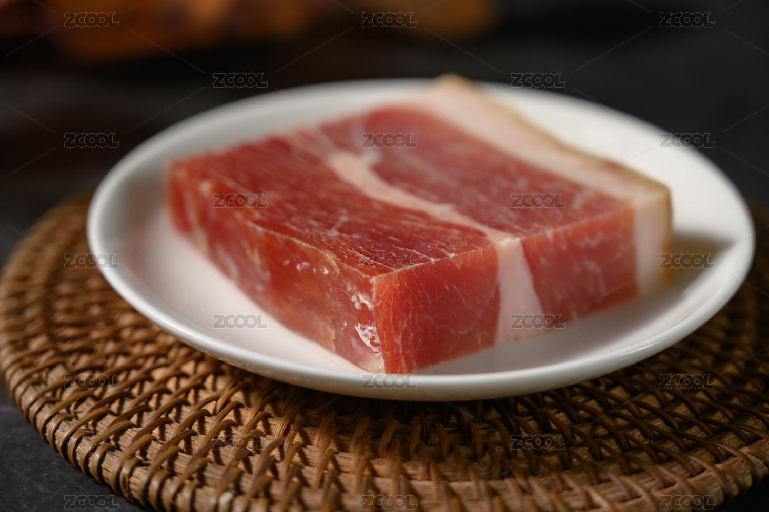 中式复古背景下放在黑色盘子中的腊肉
