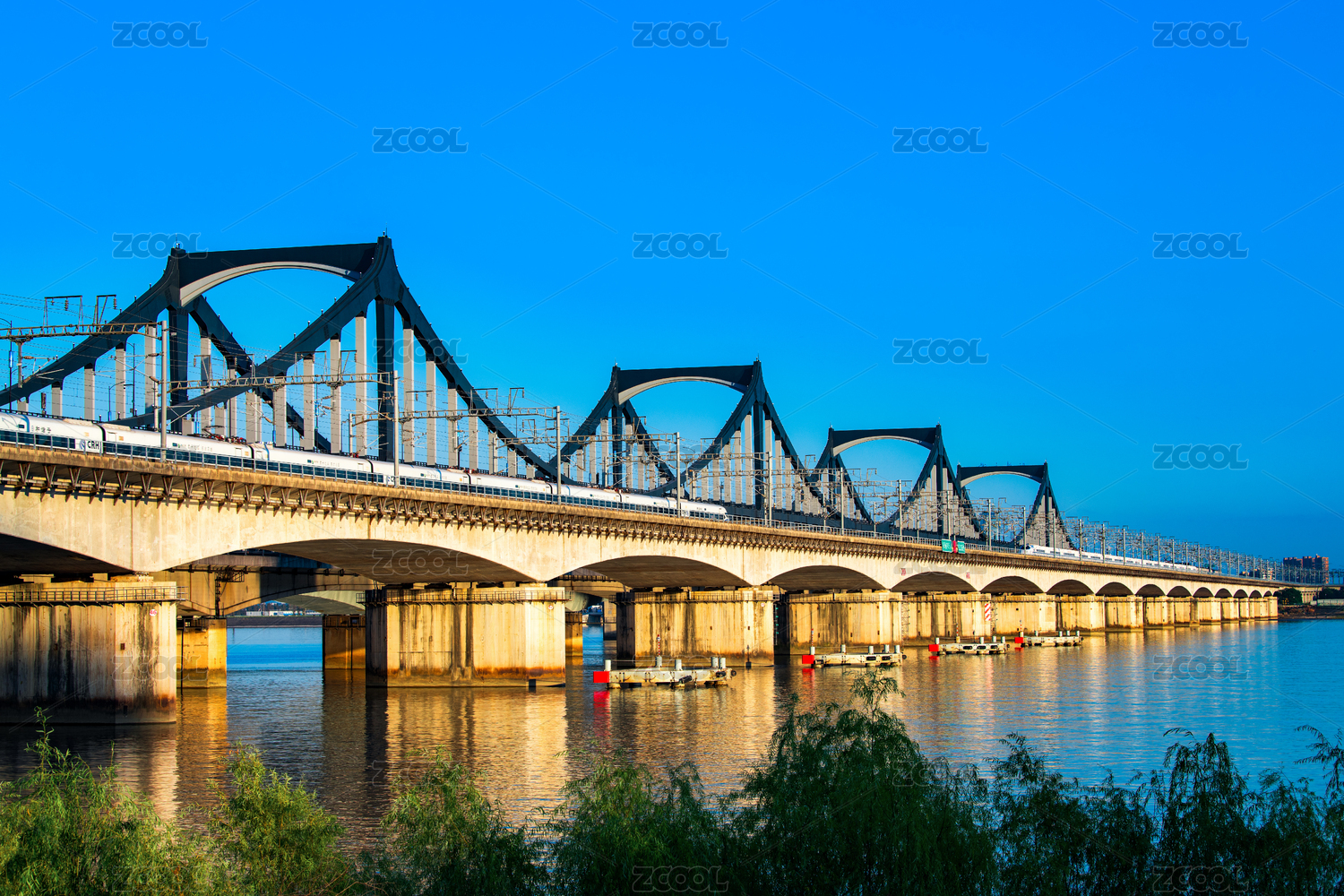 夕阳下的老旧风格工业跨江铁路大桥