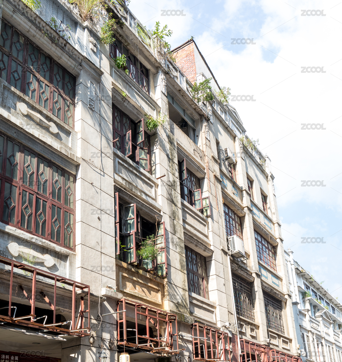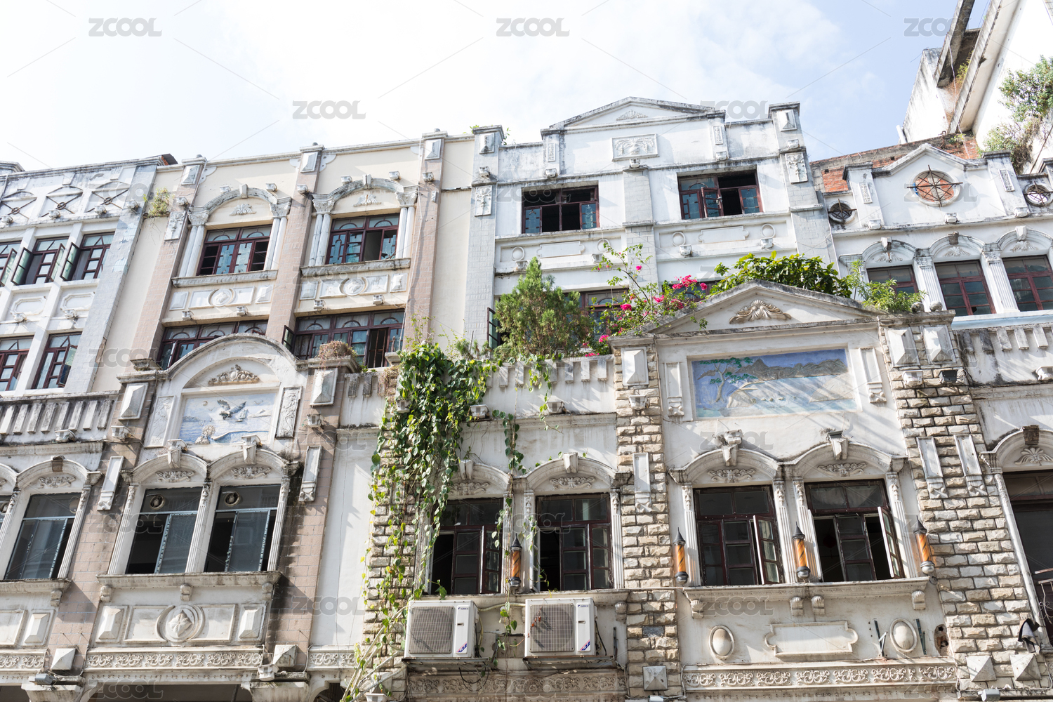晴朗蓝天下的汕头小公园西式建筑低角度视图