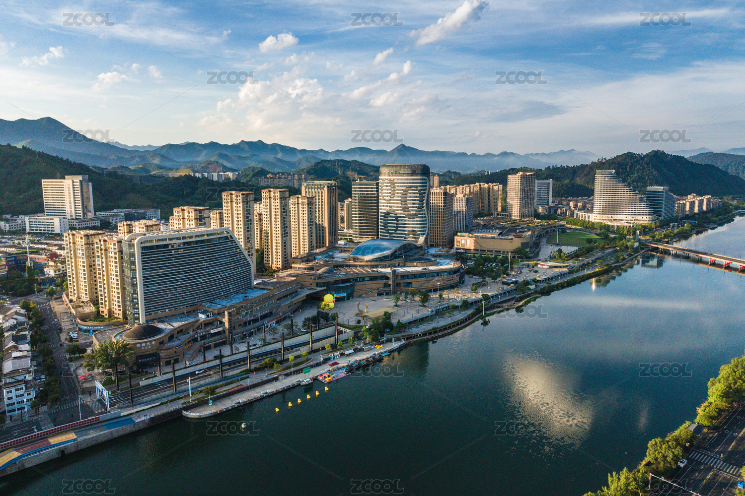 夕阳下航拍浙江省台州市天台县始丰湖公园
