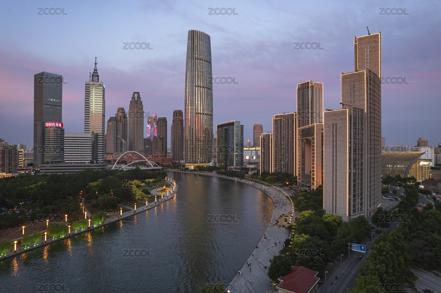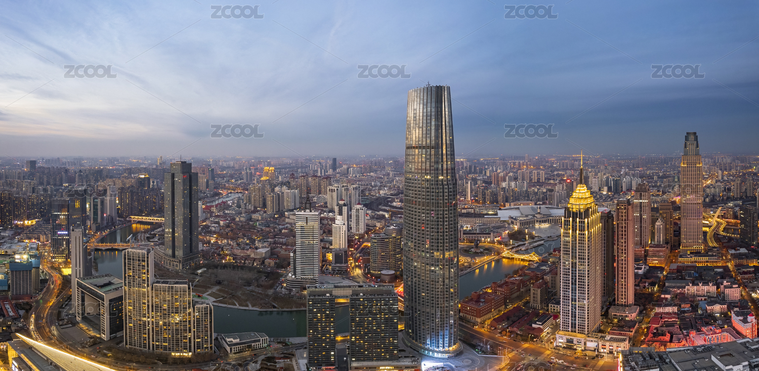 中国天津海河津湾环球金融中心日落城市风光