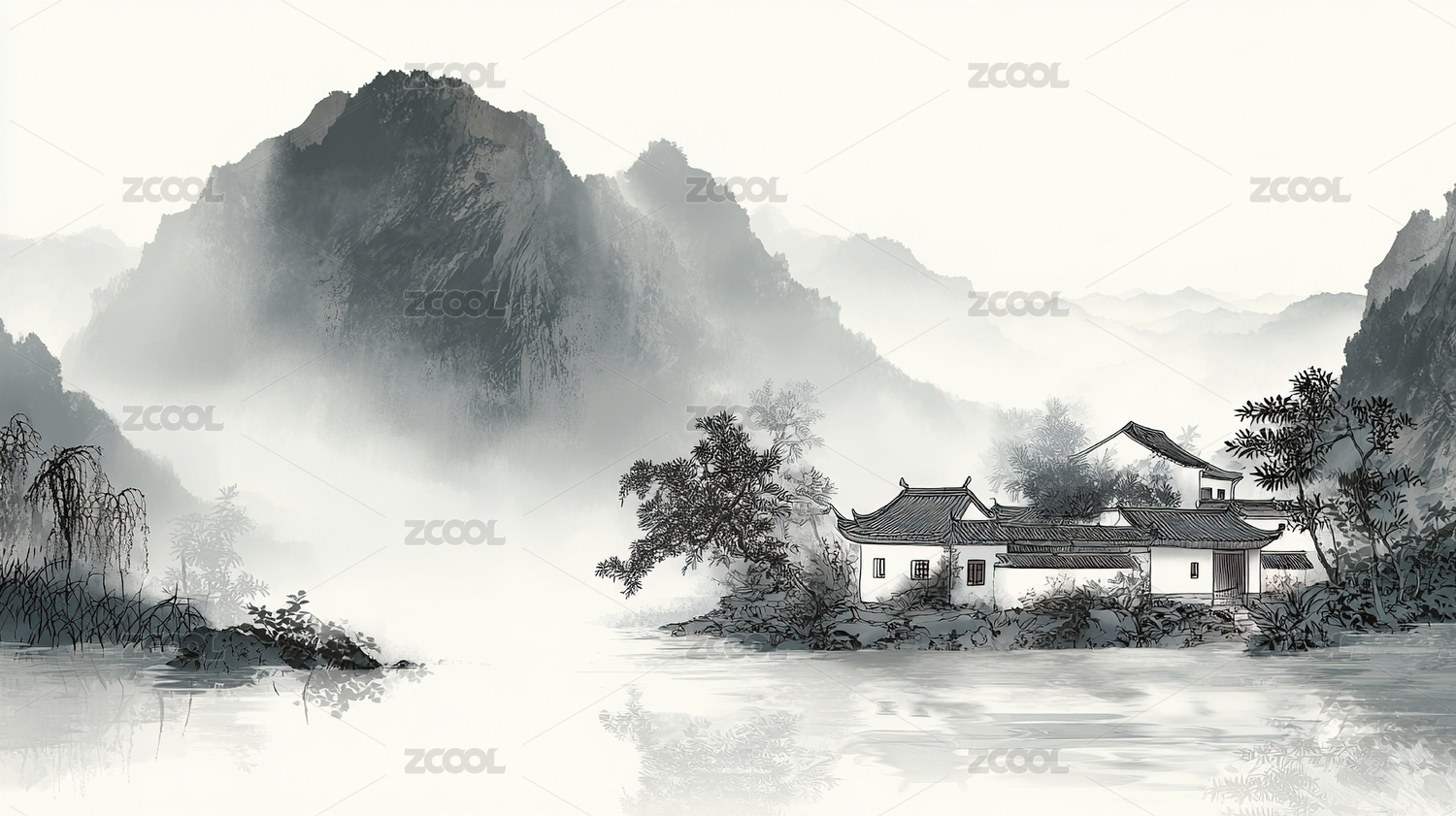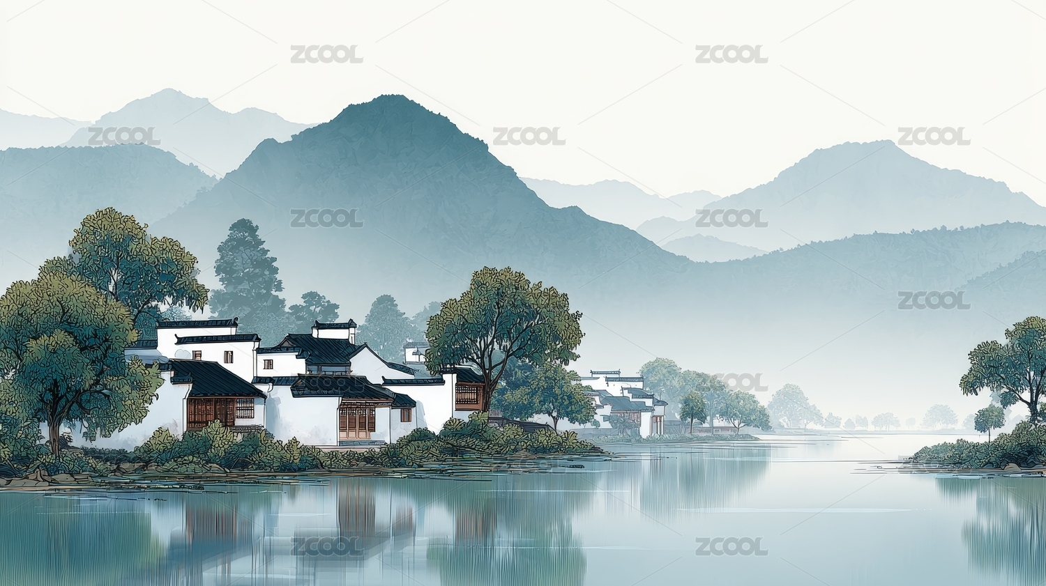 清新,宁静,自然,绿色,建筑,树木,景色,风景,绘画,田园