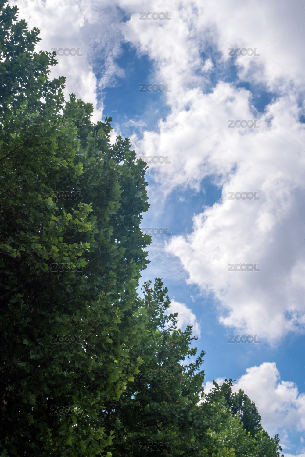 茂密的树林仰望展湛蓝的天空白云朵朵