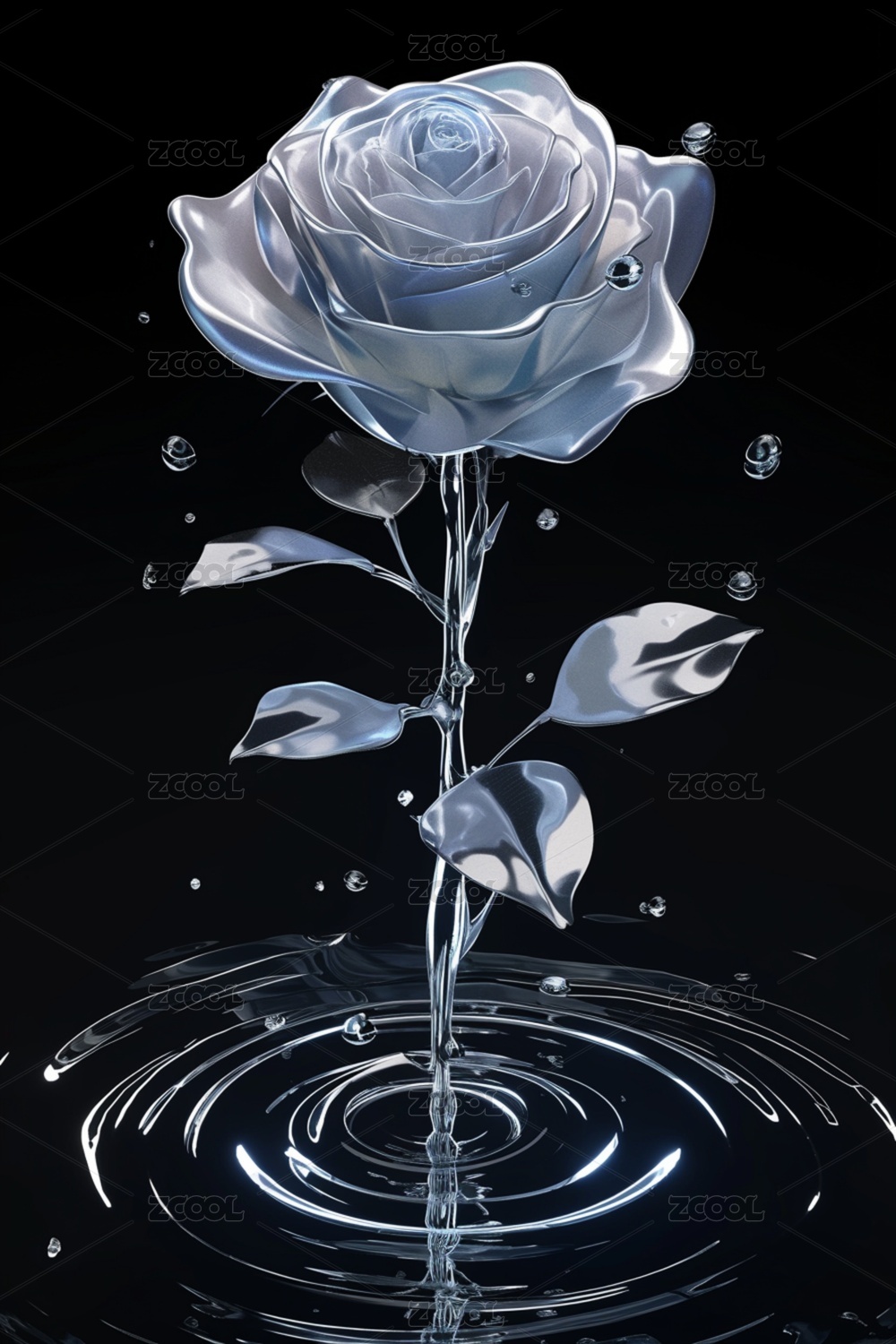 3D立体透明玻璃三维质感光感蓝玫瑰花